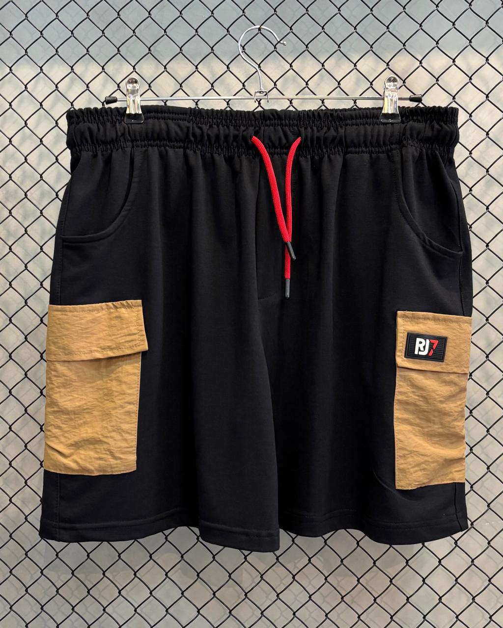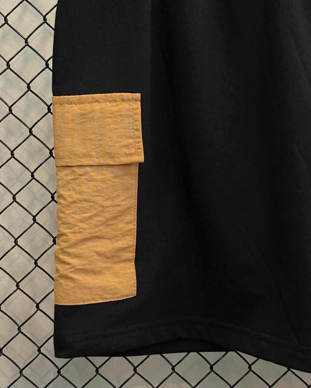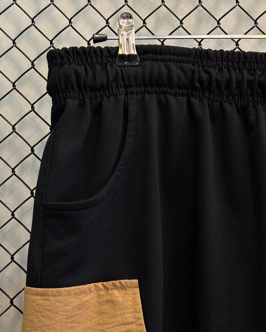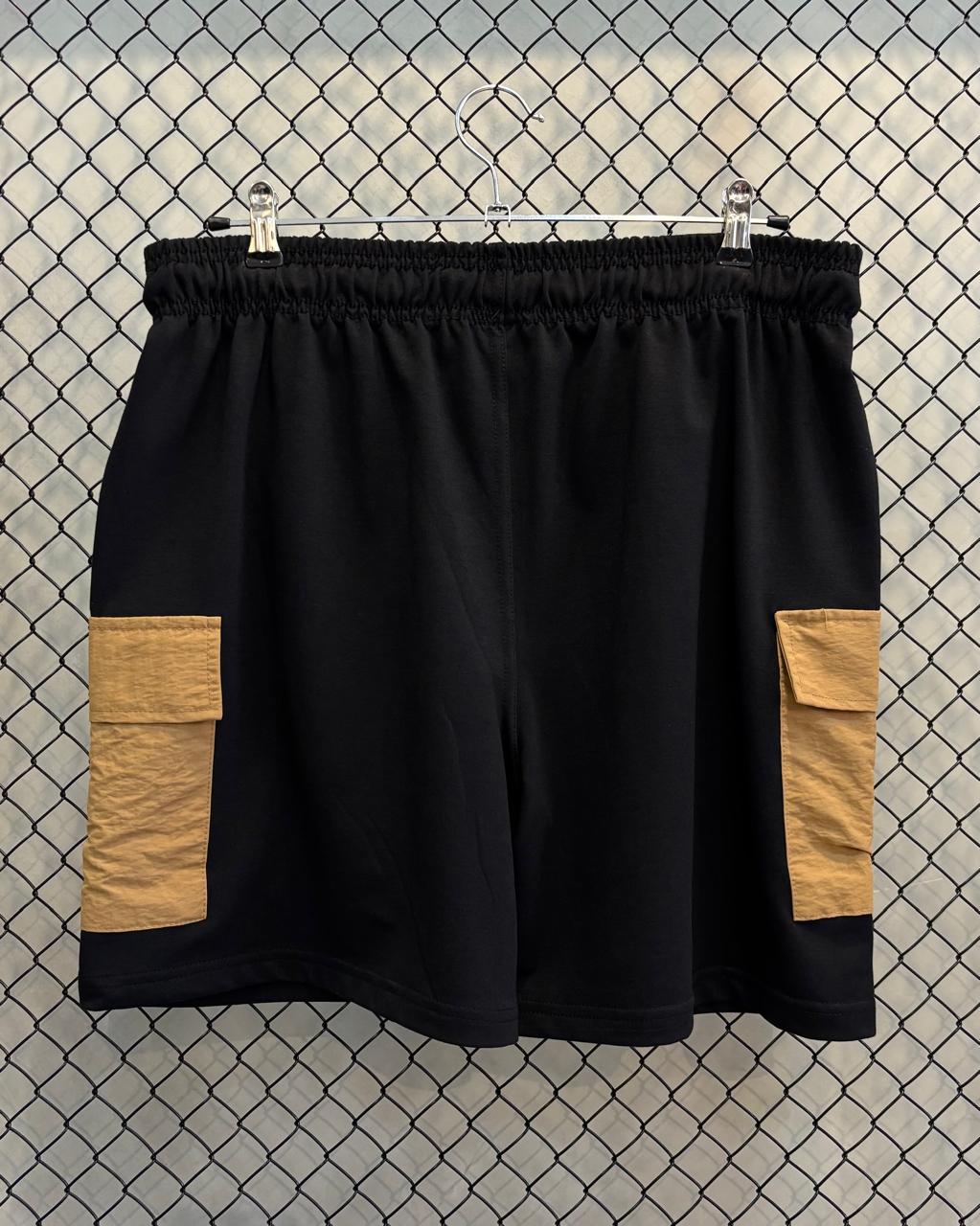 Design Duplo Contraste: O corpo da bermuda em preto fosco contrasta perfeitamente com os grandes bolsos cargo laterais em tom tan (cáqui/camel), criando um visual robusto e diferenciado.