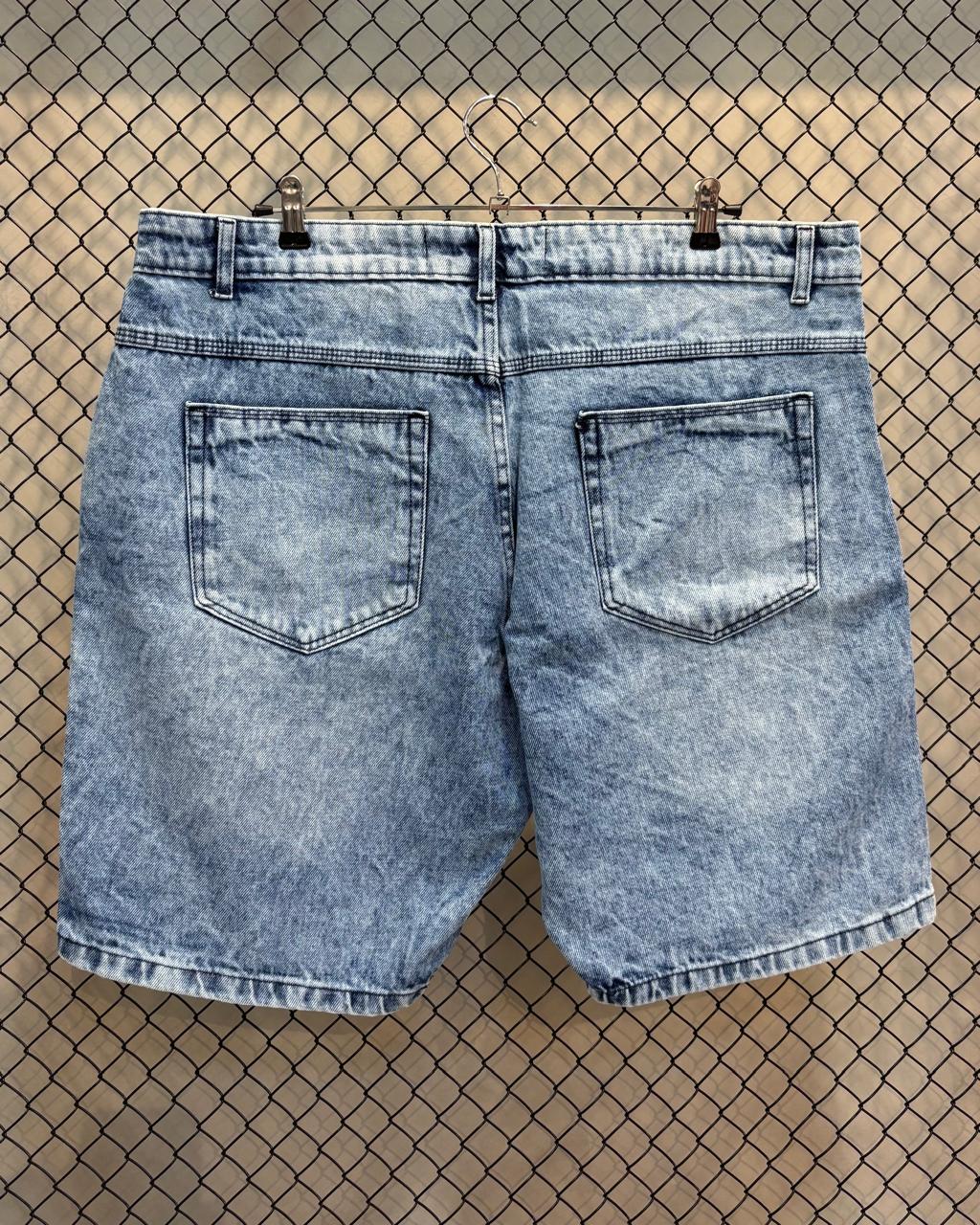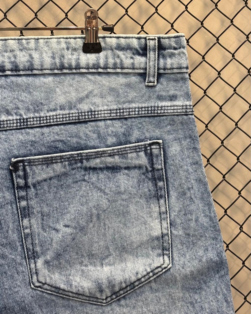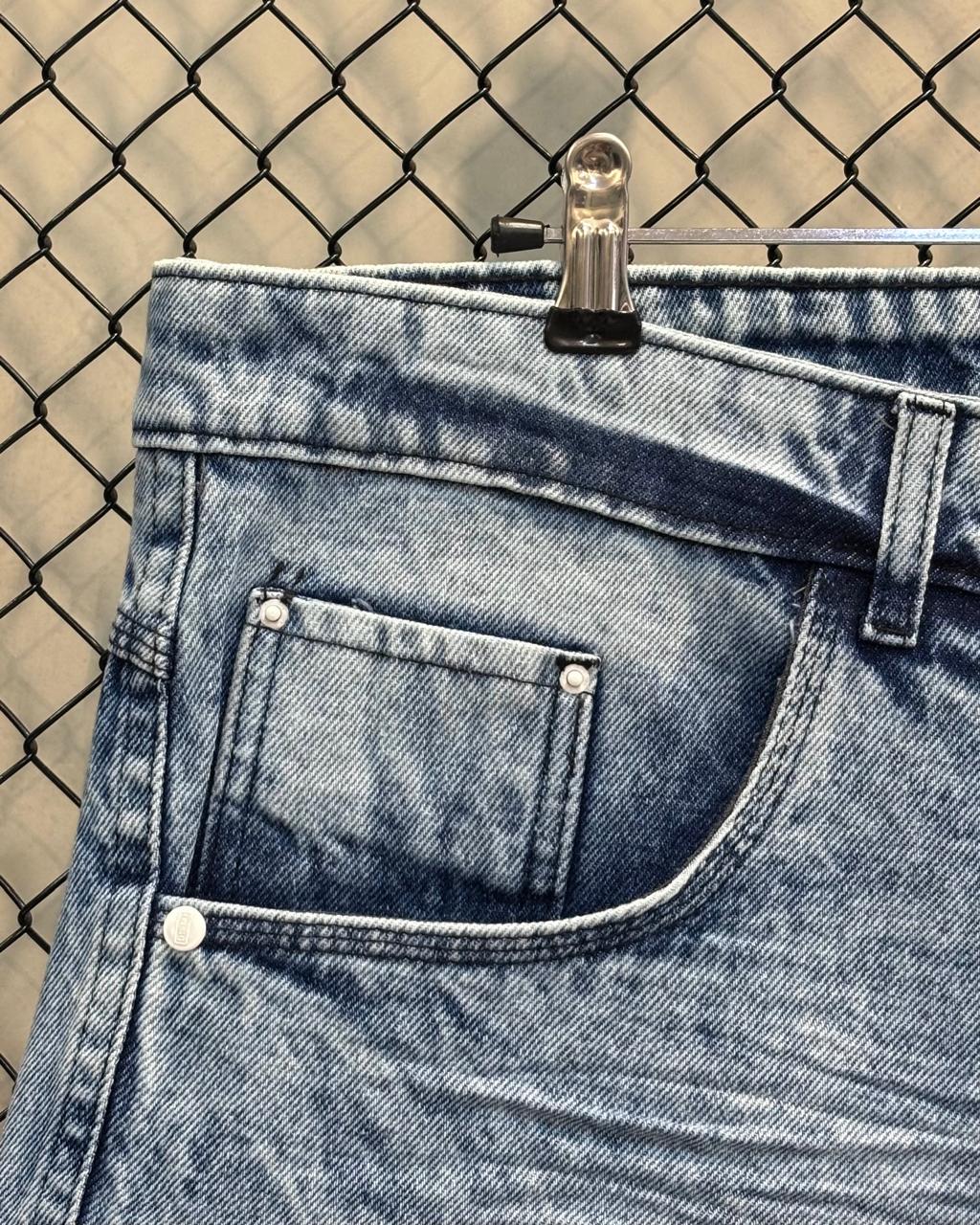 Lavagem Acid Wash: Apresenta um tom azul claro, com um efeito de lavagem marmorizada ou "acid wash" que confere um visual vintage e descontraído, com áreas de desgaste natural e vincos que adicionam textura e profundidade à cor.