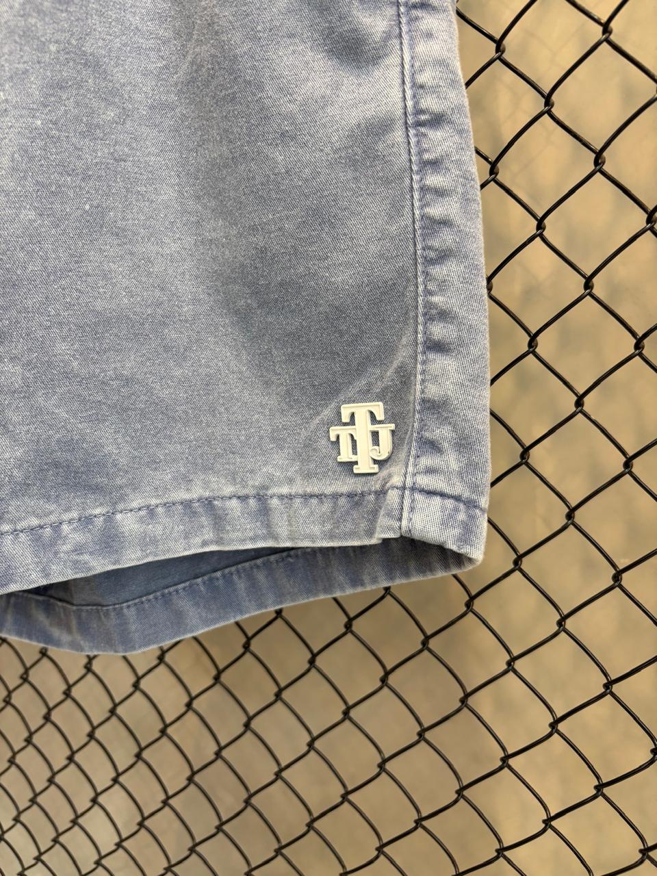 Logotipo "TJ" Bordado em Branco: O selo de autenticidade da marca é aplicado de forma minimalista na barra frontal, criando um contraste discreto com o tom azulado da sarja.