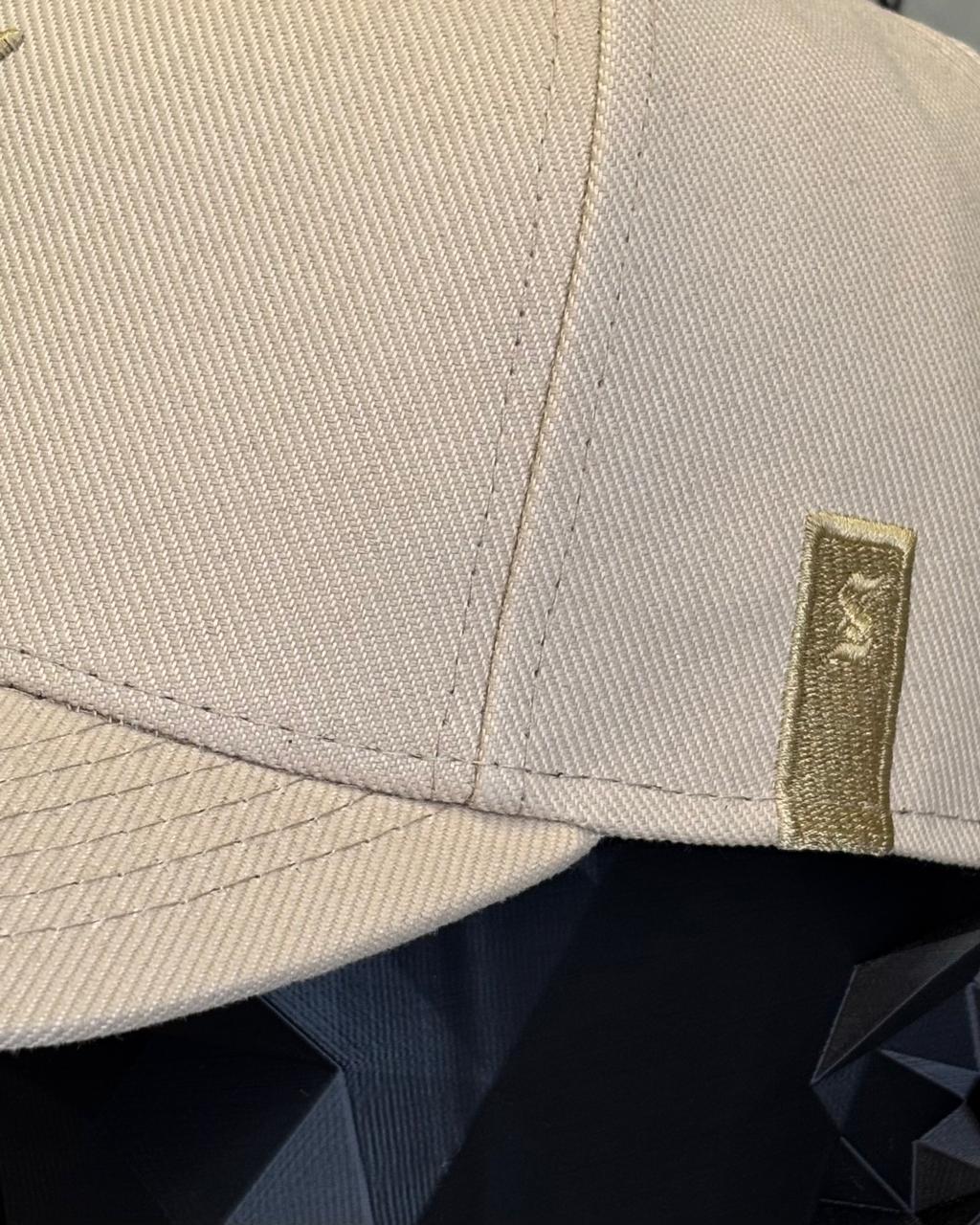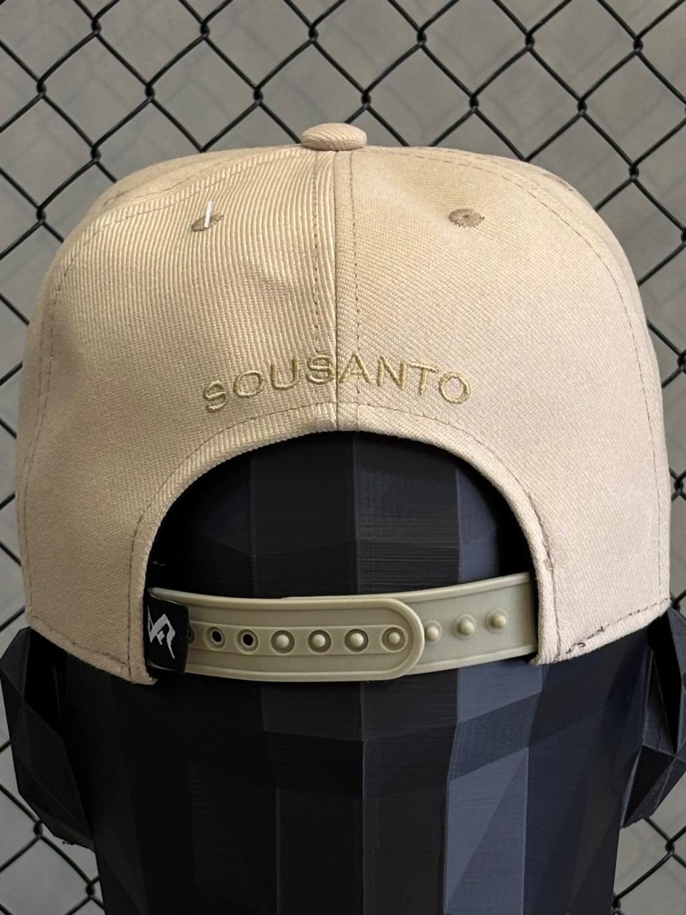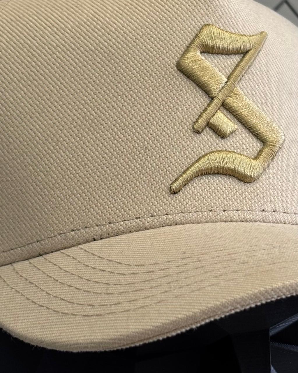 A Sou Santo apresenta um boné que vai além do acessório convencional, trazendo uma carga simbólica aliada à estética premium. O contraste entre o tecido bege e o bordado dourado confere um ar de exclusividade e prestígio.