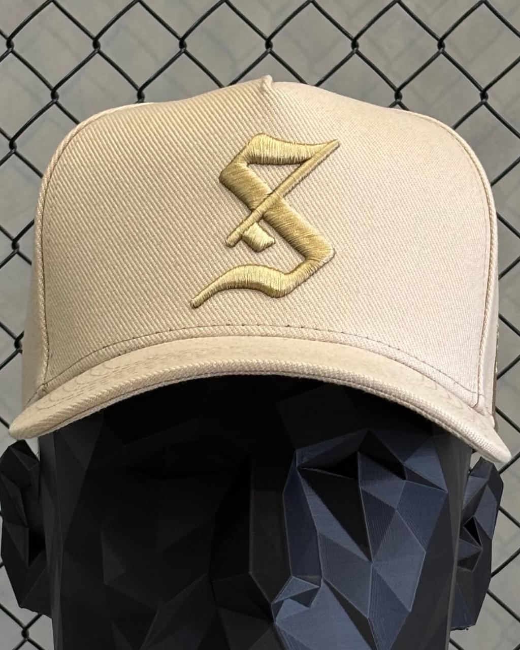 Logotipo "S" em Bordado 3D Dourado: O icônico "S" em fonte gótica é aplicado com bordado de alta densidade e relevo acentuado, utilizando linha em tom de ouro que brilha conforme a luz.