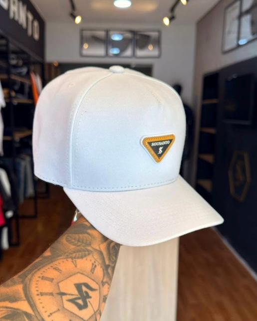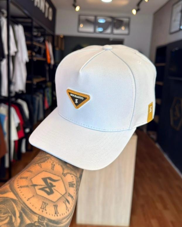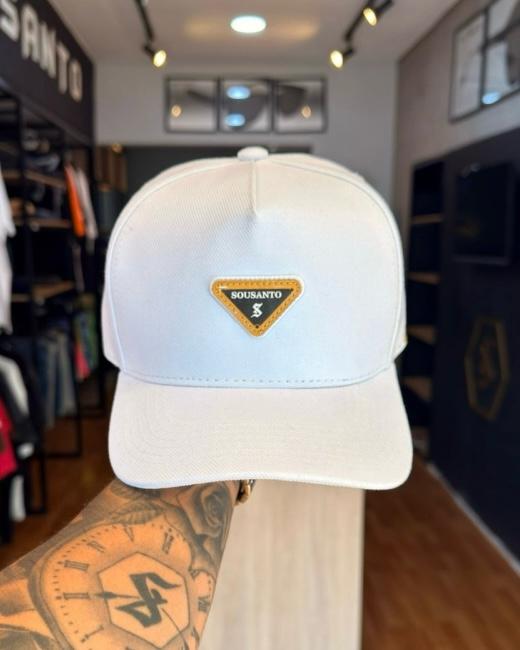 Esse boné Sou Santo foi projetado para quem entende que o luxo está nos detalhes. Com uma base em branco puro, esta peça utiliza o dourado de forma estratégica para criar um ponto de luz que atrai olhares, mantendo uma estética extremamente elegante e moderna.