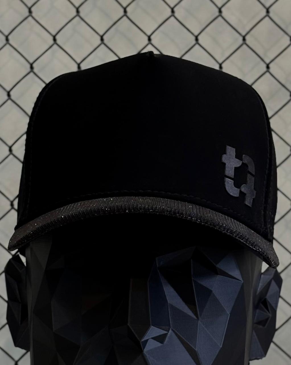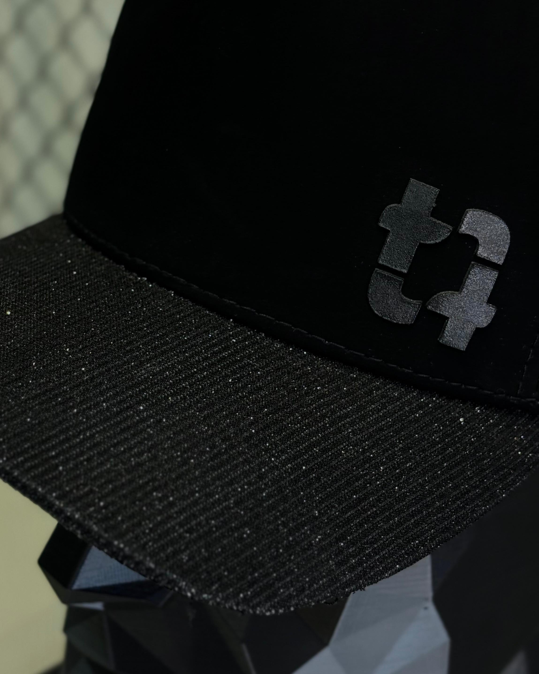 Este boné é para quem é titular do seu estilo e exige sofisticação até nos acessórios mais casuais. O diferencial inconfundível desta edição é o acabamento da aba em tecido texturizado preto com microbrilhos (sparkle). Esse detalhe discreto capta a luz e adiciona uma dimensão de glamour e modernidade, diferenciando-o de qualquer boné preto comum.