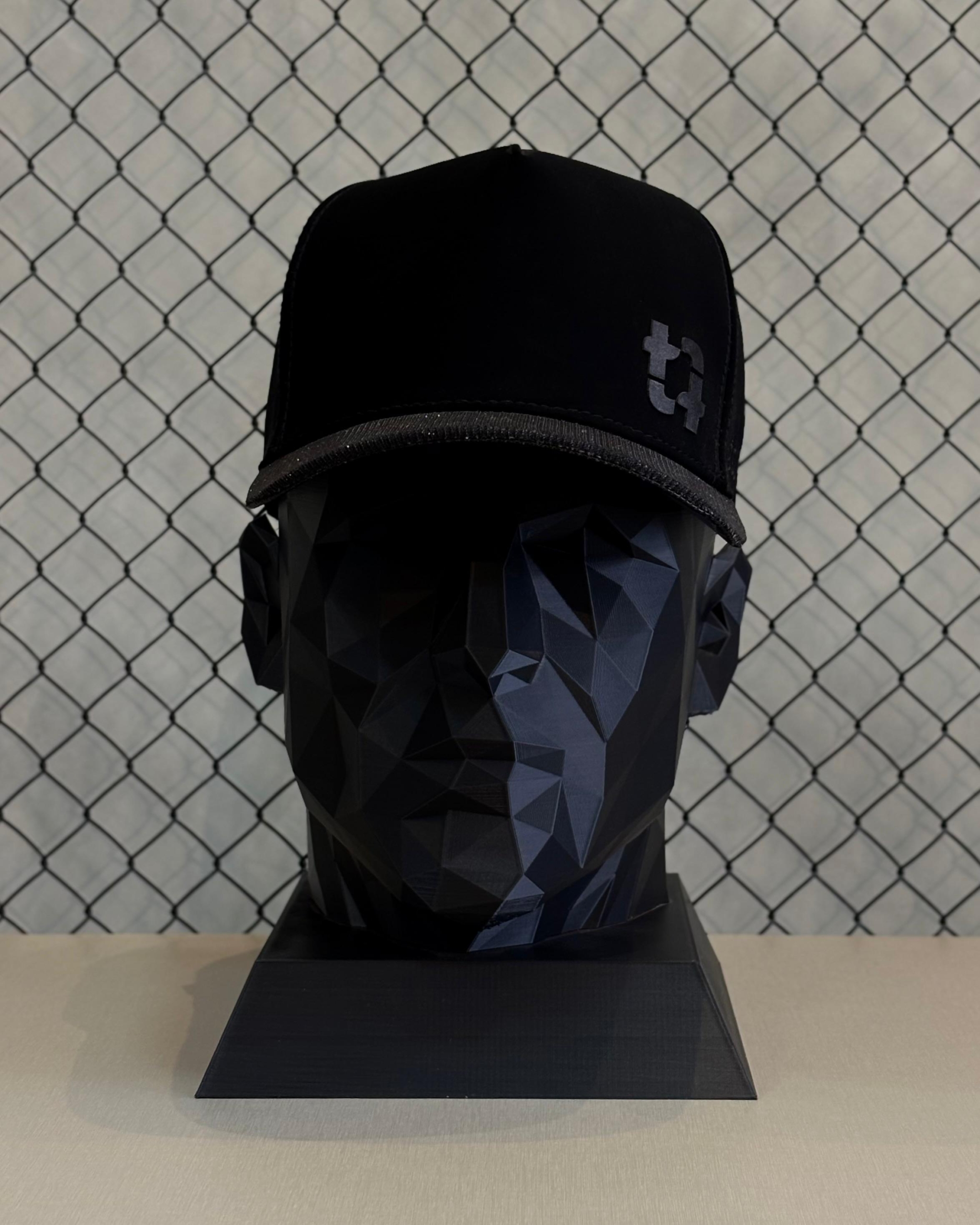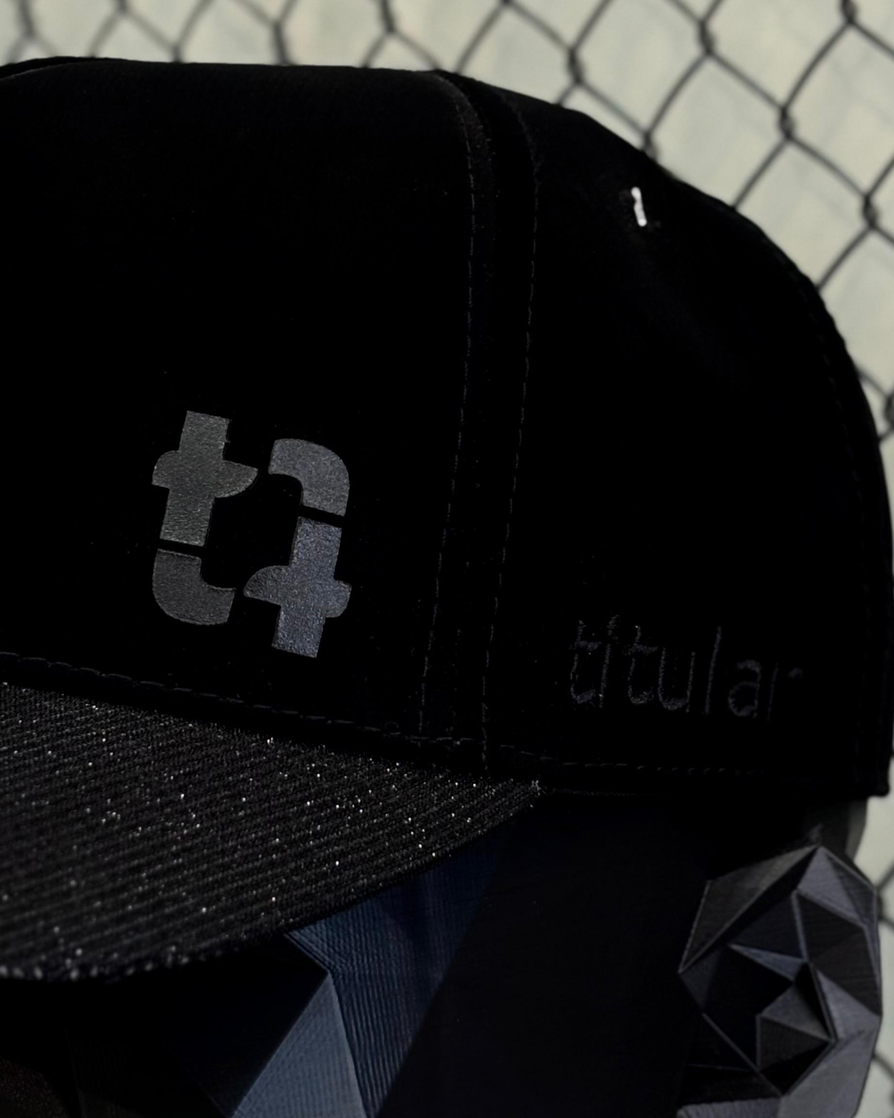 O emblema estilizado da Titular Jeans é aplicado na copa em alto-relevo preto (black on black). Este design sutil e monocromático é a assinatura da elegância minimalista e atitude premium da marca. A estrutura trucker combina a copa frontal em tecido resistente e a tela traseira, garantindo máxima respirabilidade e um caimento estruturado e confortável.