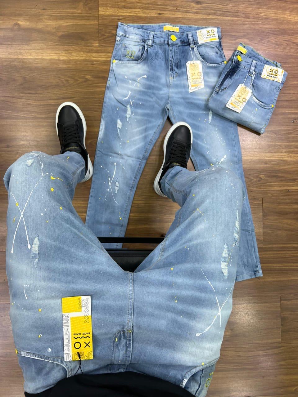 Etiquetas de Destaque: A etiqueta principal da marca, em amarelo vibrante, apresenta o símbolo "XO" e a inscrição "BROW JEANS", reforçando a exclusividade do design.