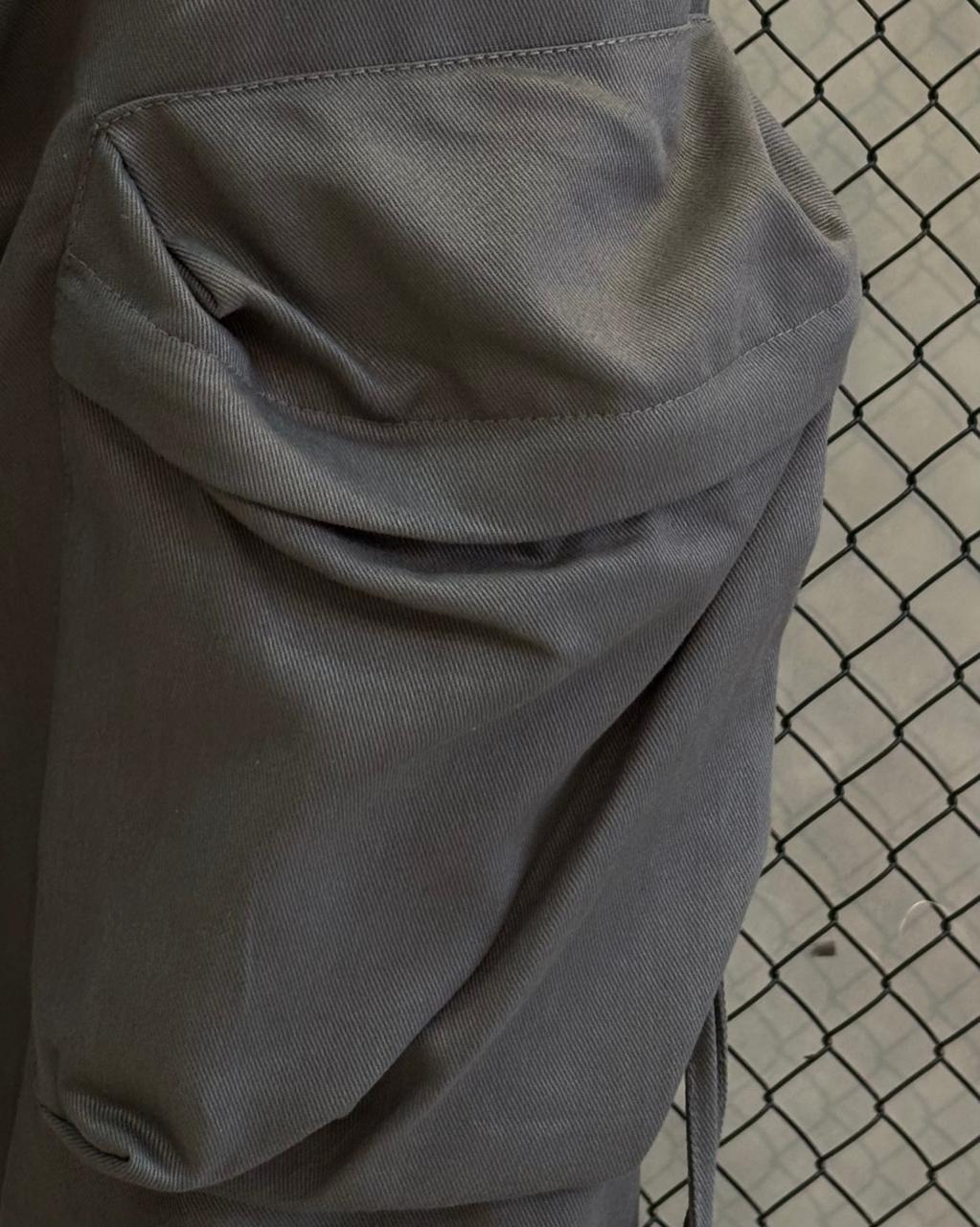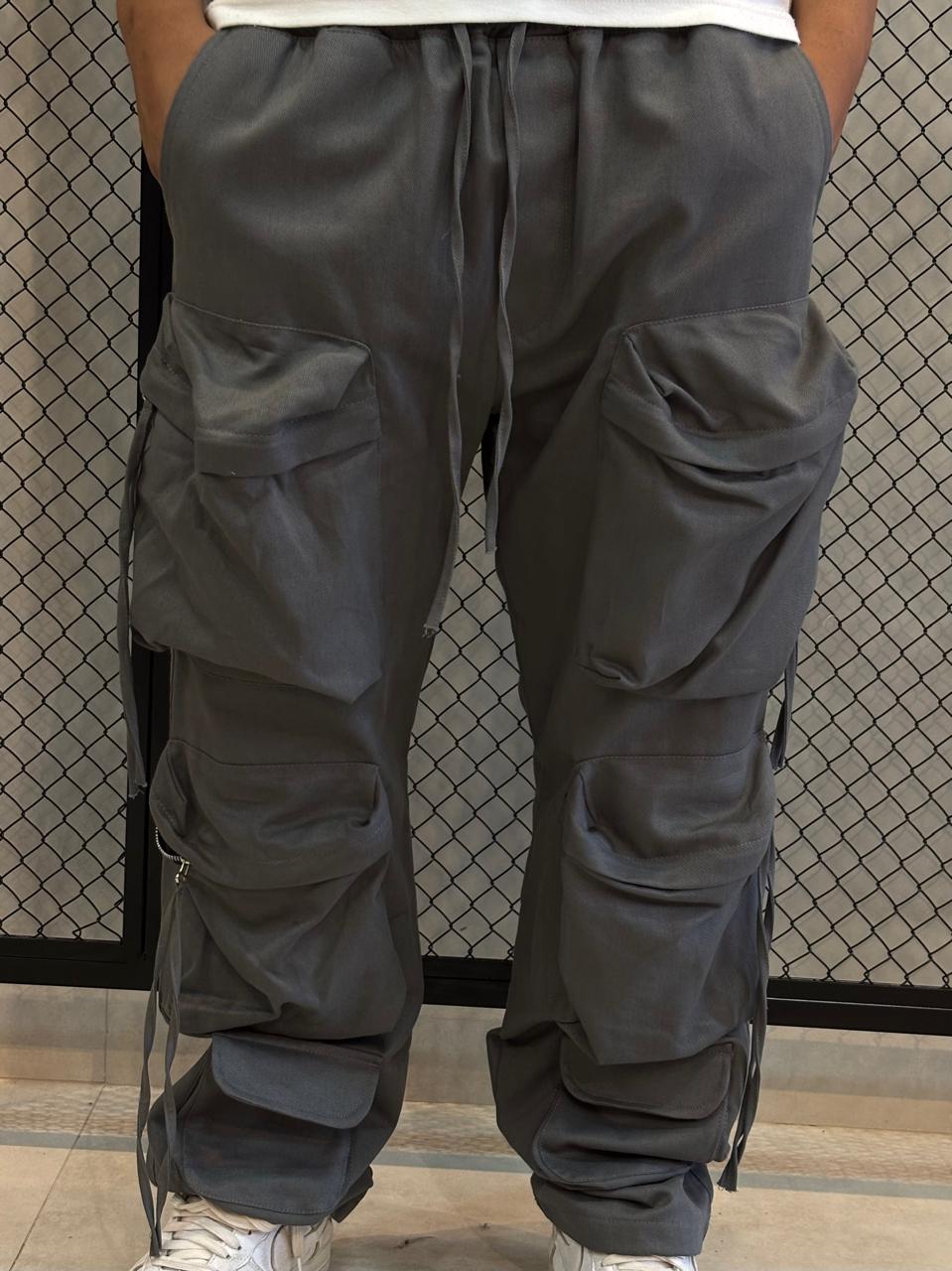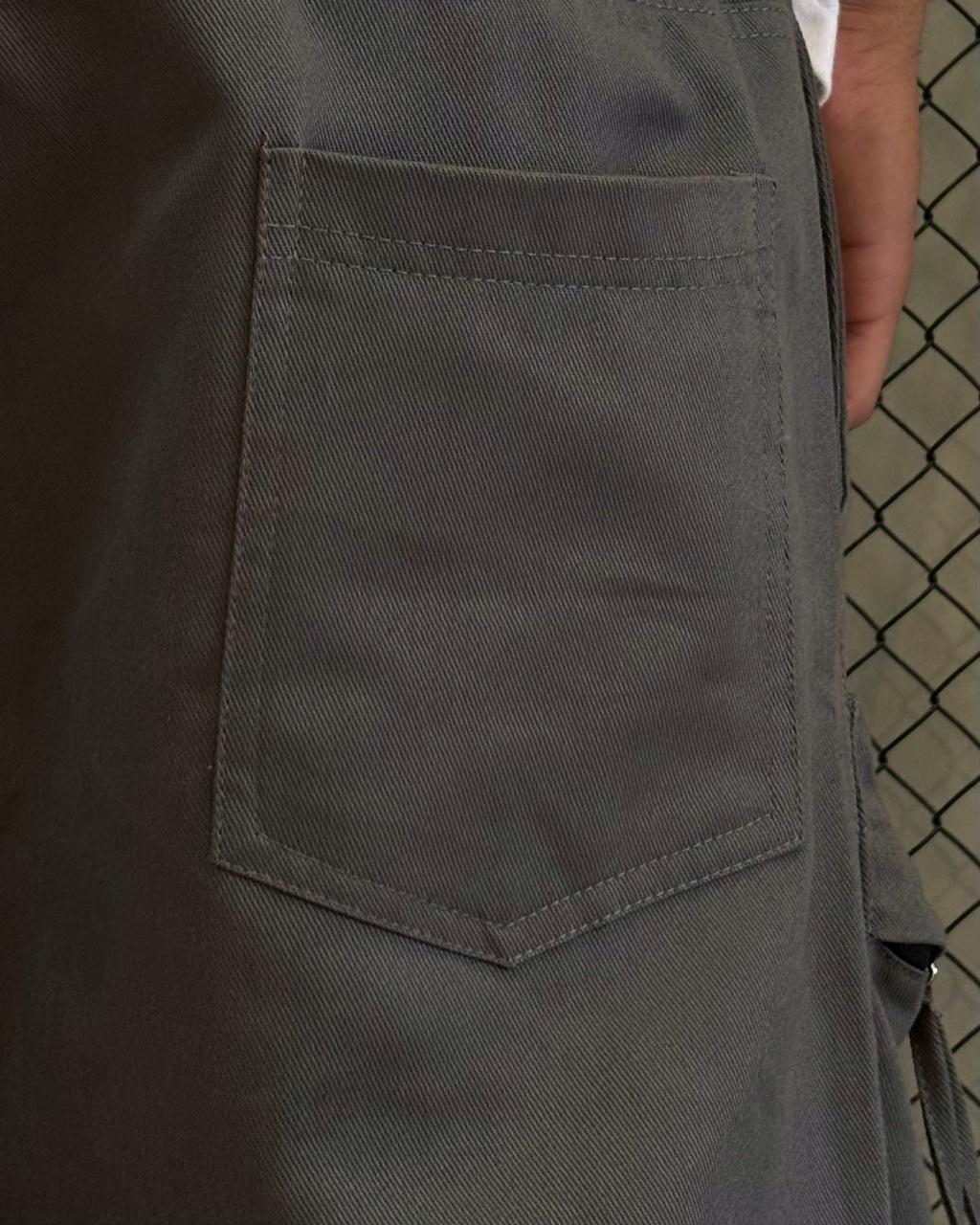 Múltiplos Bolsos: O design é caracterizado pela quantidade e volume dos bolsos cargo. Há grandes bolsos tridimensionais nas laterais, coxas e possivelmente perto da barra, criados com pregas e dobras de tecido, adicionando textura e um visual "inchado" e utilitário. Os múltiplos compartimentos reforçam a funcionalidade do cargo, permitindo o armazenamento de diversos itens de forma segura.