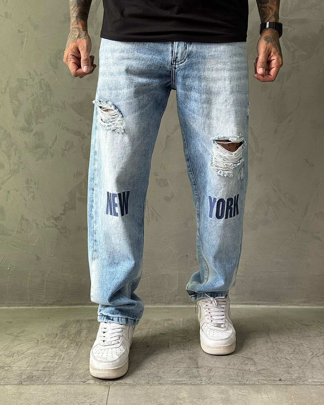 Estampa "NEW YORK": O grande destaque é a estampa na cor azul na frente das pernas, formando a palavra "NEW" em uma e "YORK" na outra. Esta estampa é um poderoso elemento de estilo urbano e inspiração internacional.