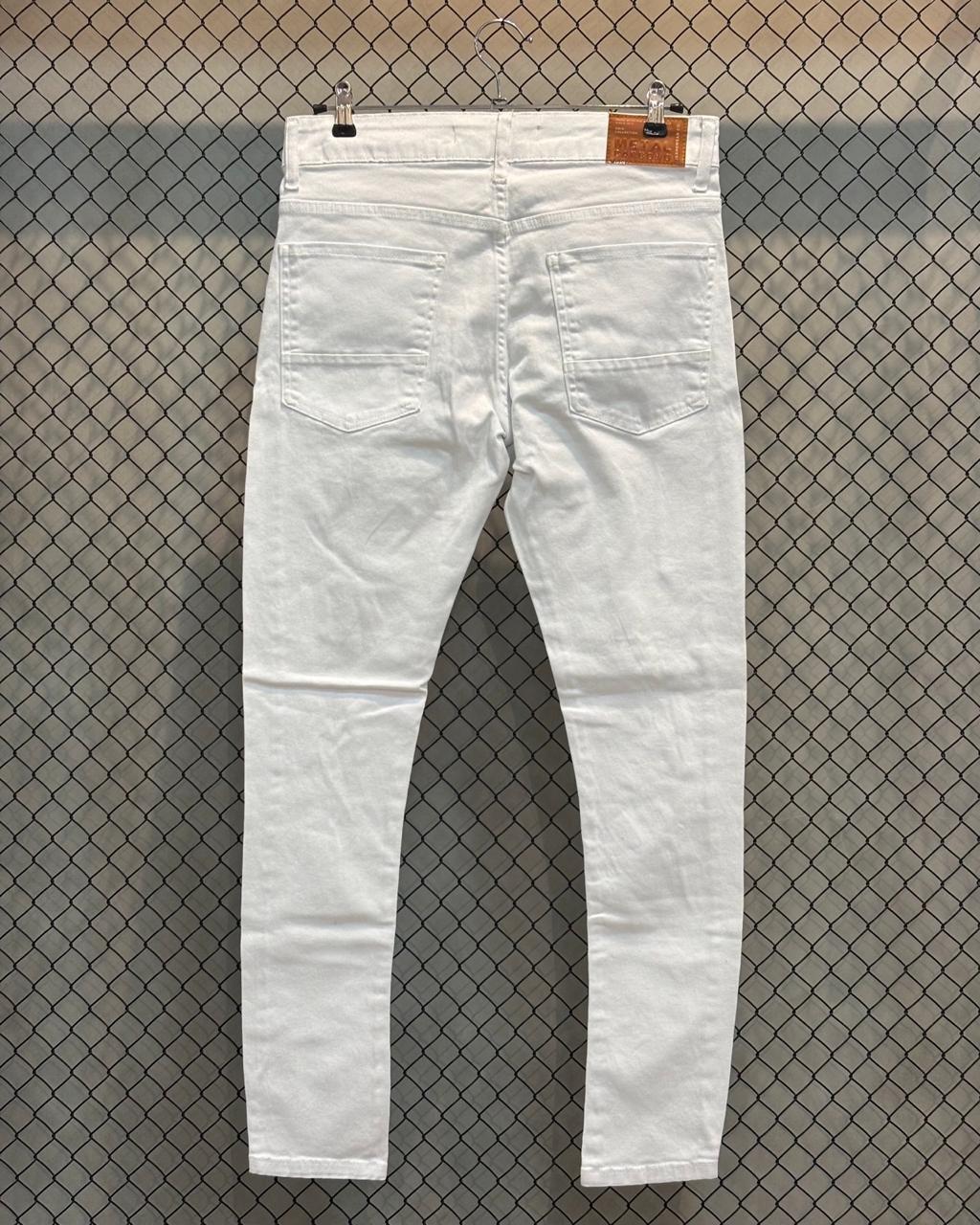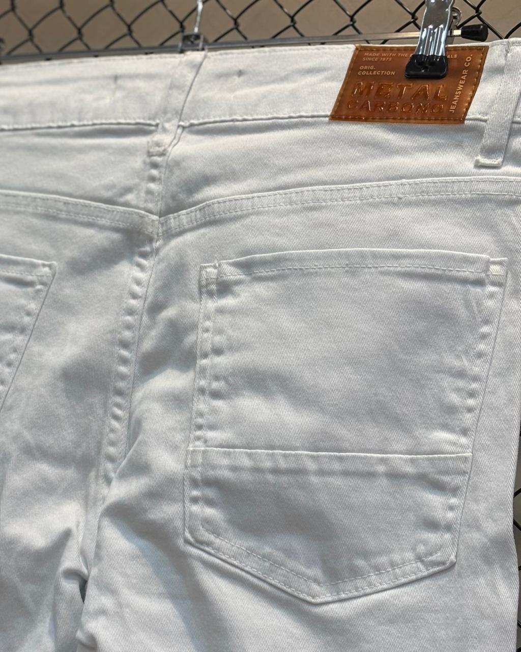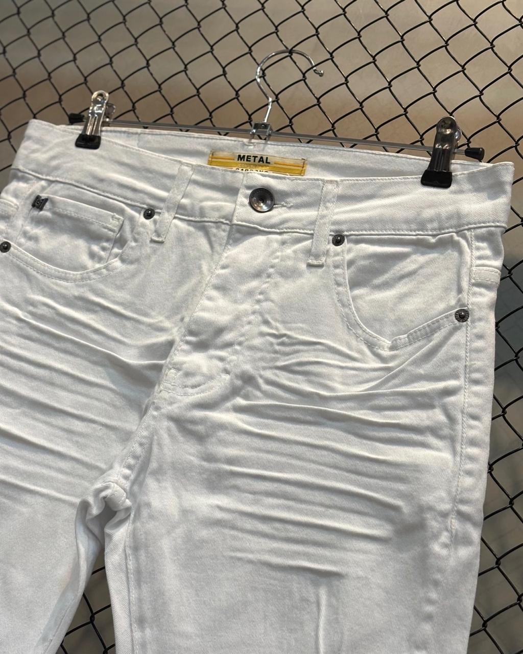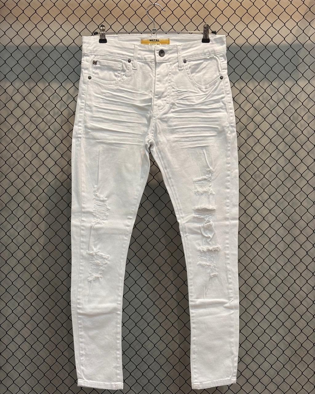 A Metal Carbono apresenta uma peça que une a pureza do jeans branco ao estilo rebelde do acabamento destroyed. Esta calça é projetada para ser o ponto central do look, oferecendo um visual limpo, porém carregado de detalhes técnicos de lavanderia e customização.