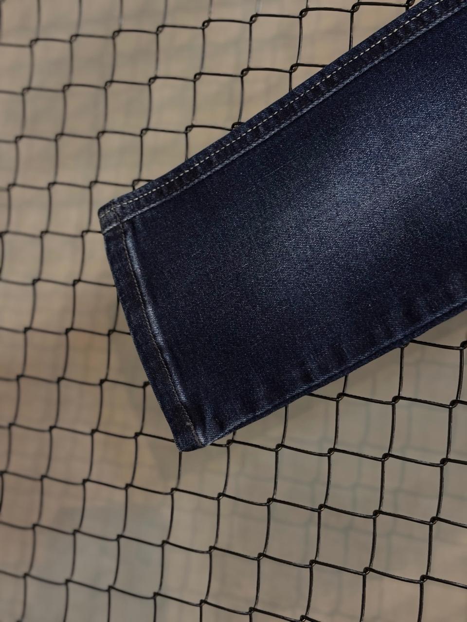 Lavagem Dark Blue com Estonagem Localizada: O denim possui um tom azul marinho profundo, apresentando clareamentos suaves e estratégicos nas coxas e joelhos, que conferem dimensão e um aspecto levemente usado e autêntico.