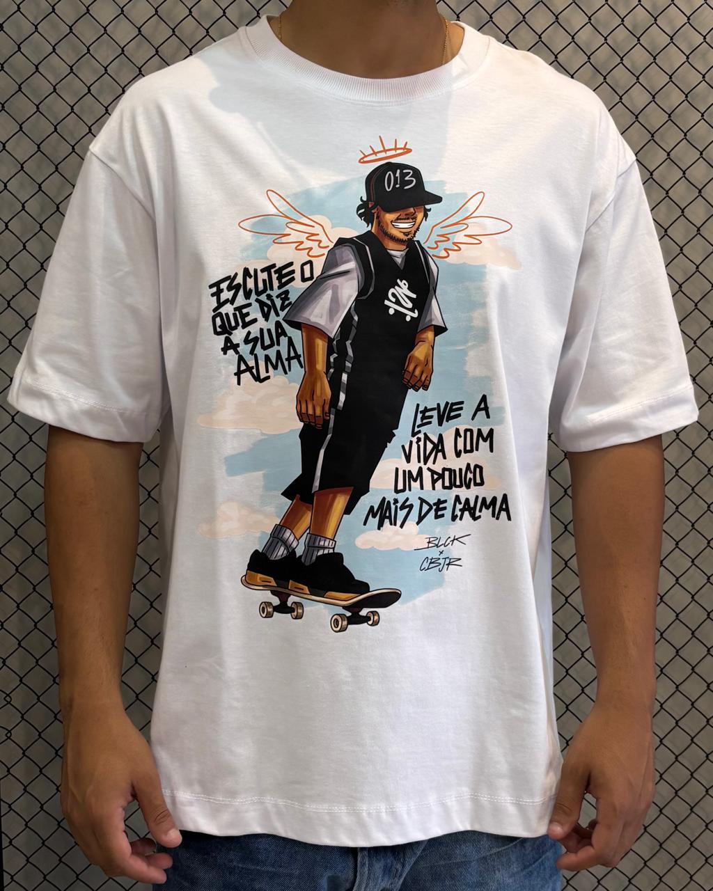 Arte Central e Personagem: A estampa traz uma ilustração de um skatista (Charlie Brown Jr.) sorridente em ação. Ele usa um boné com uma auréola e a inscrição "013!" (referência à Baixada Santista), conferindo um toque de realeza urbana e orgulho local.