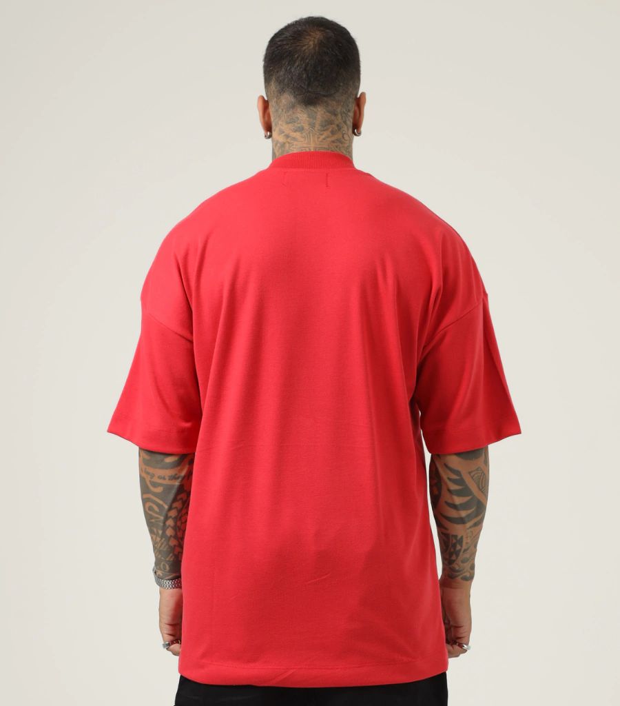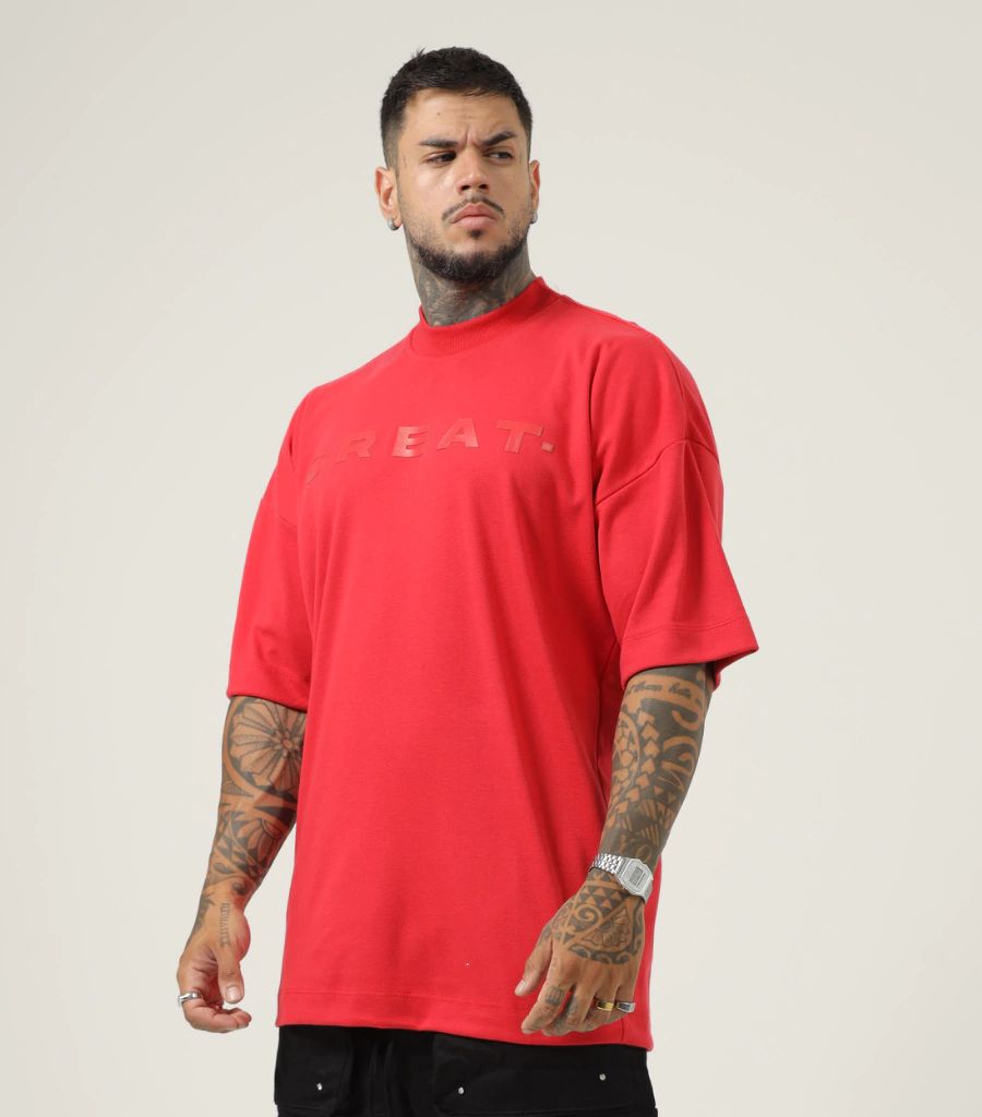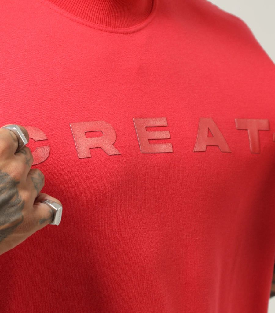 Logotipo "CREAT." em Relevo Emborrachado: Apresenta a marca centralizada no peito com um acabamento emborrachado de alto brilho (glossy), criando um efeito tom sobre tom sobre o tecido vermelho.