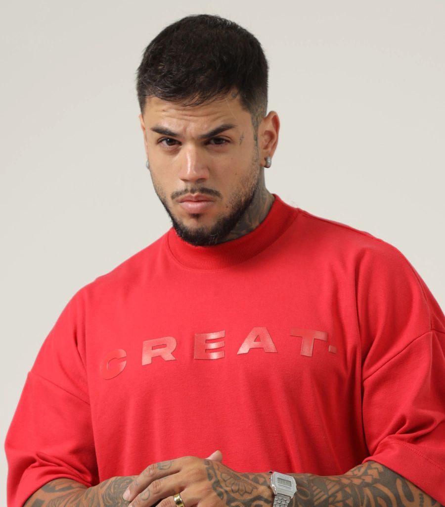 A Creat traz nesta peça uma proposta de luxo urbano, onde o vermelho vibrante é o protagonista absoluto. O design é elevado pelo uso de aplicações em relevo que brilham sob a luz, criando um contraste sutil e elegante com a malha fosca.