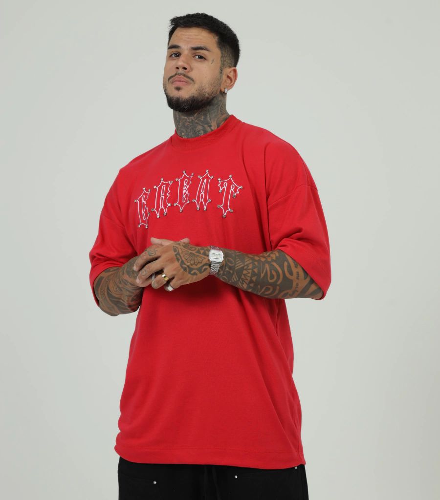 Estampa Frontal "CREAT" Estilizada: Apresenta a inscrição da marca em fonte gótica branca com contornos detalhados, criando um contraste vibrante sobre o fundo vermelho.