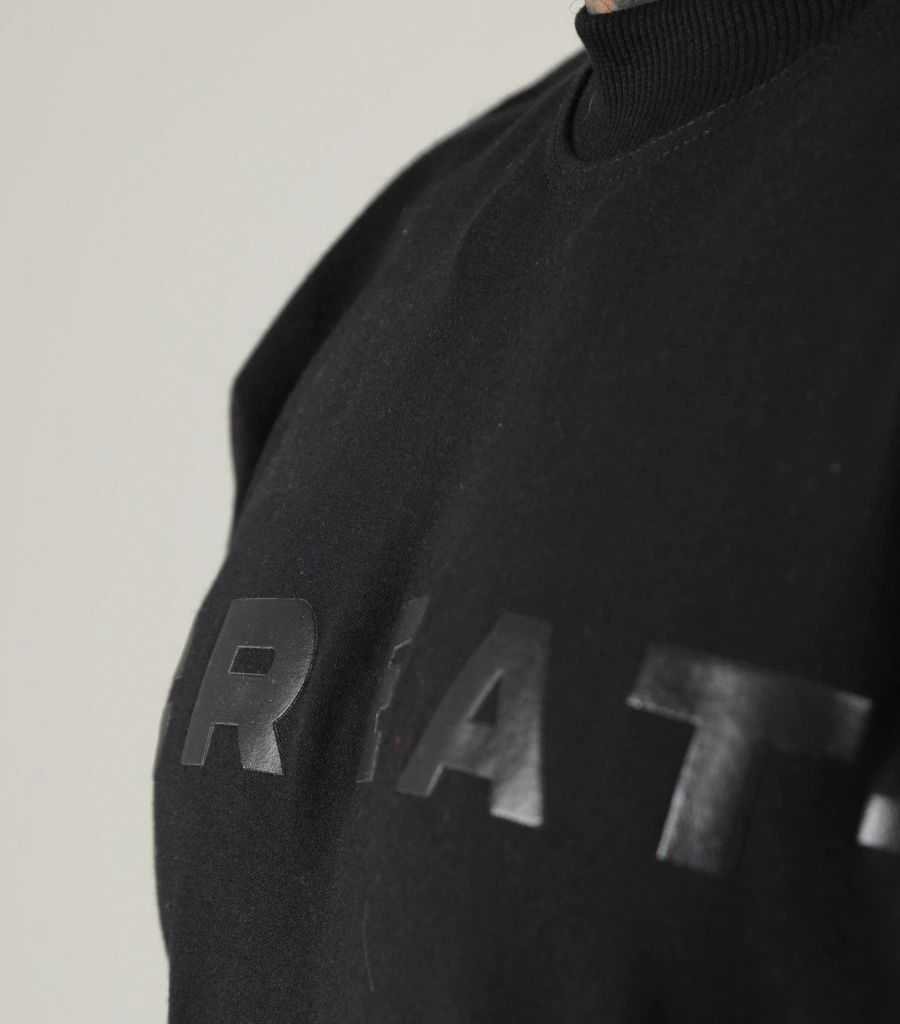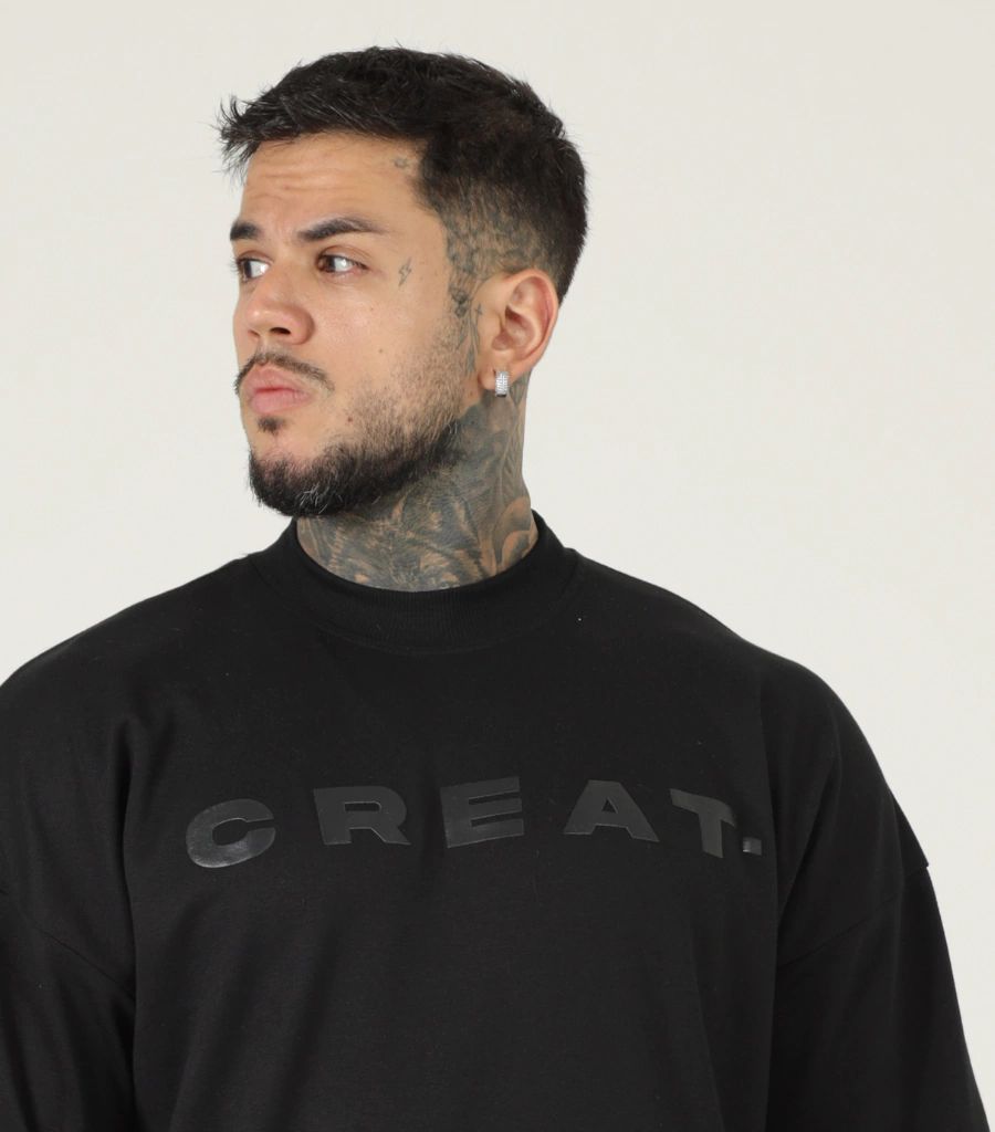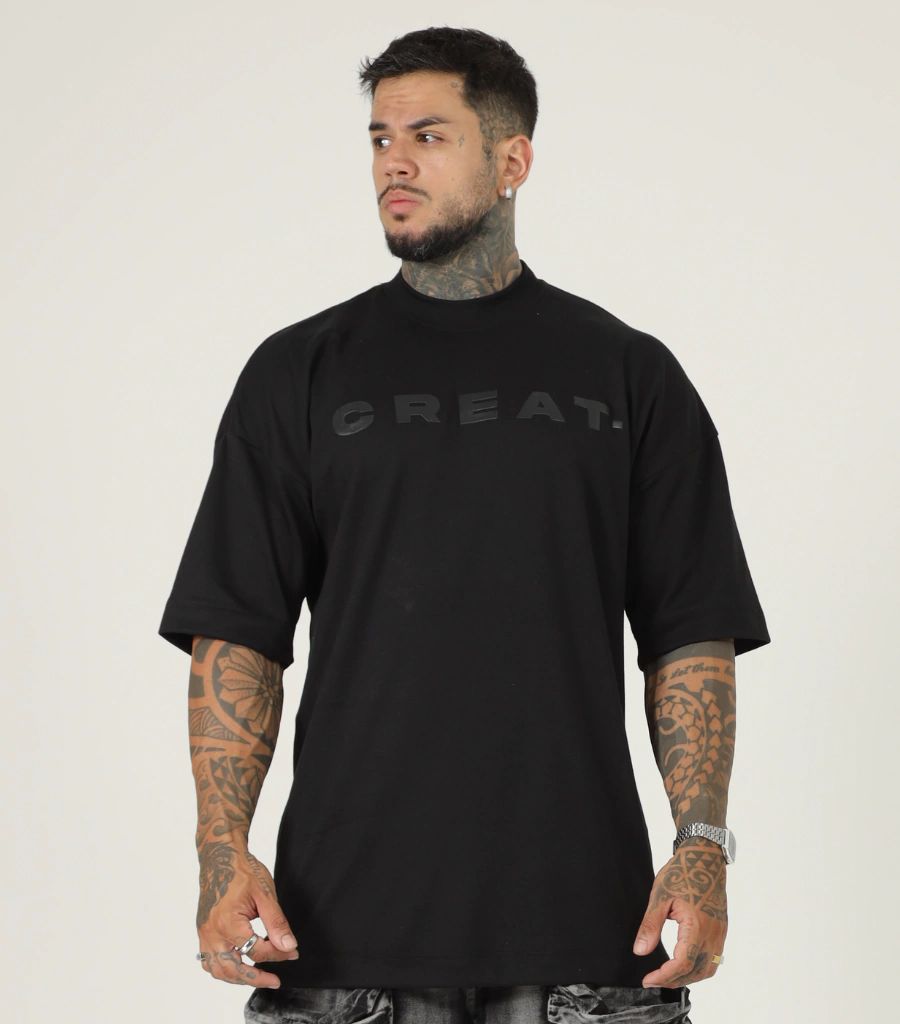 Logotipo "CREAT." em Relevo Emborrachado: Apresenta a marca centralizada no peito em um tom de preto brilhante (glossy) sobre a malha fosca, criando um efeito visual "tom sobre tom" sofisticado.