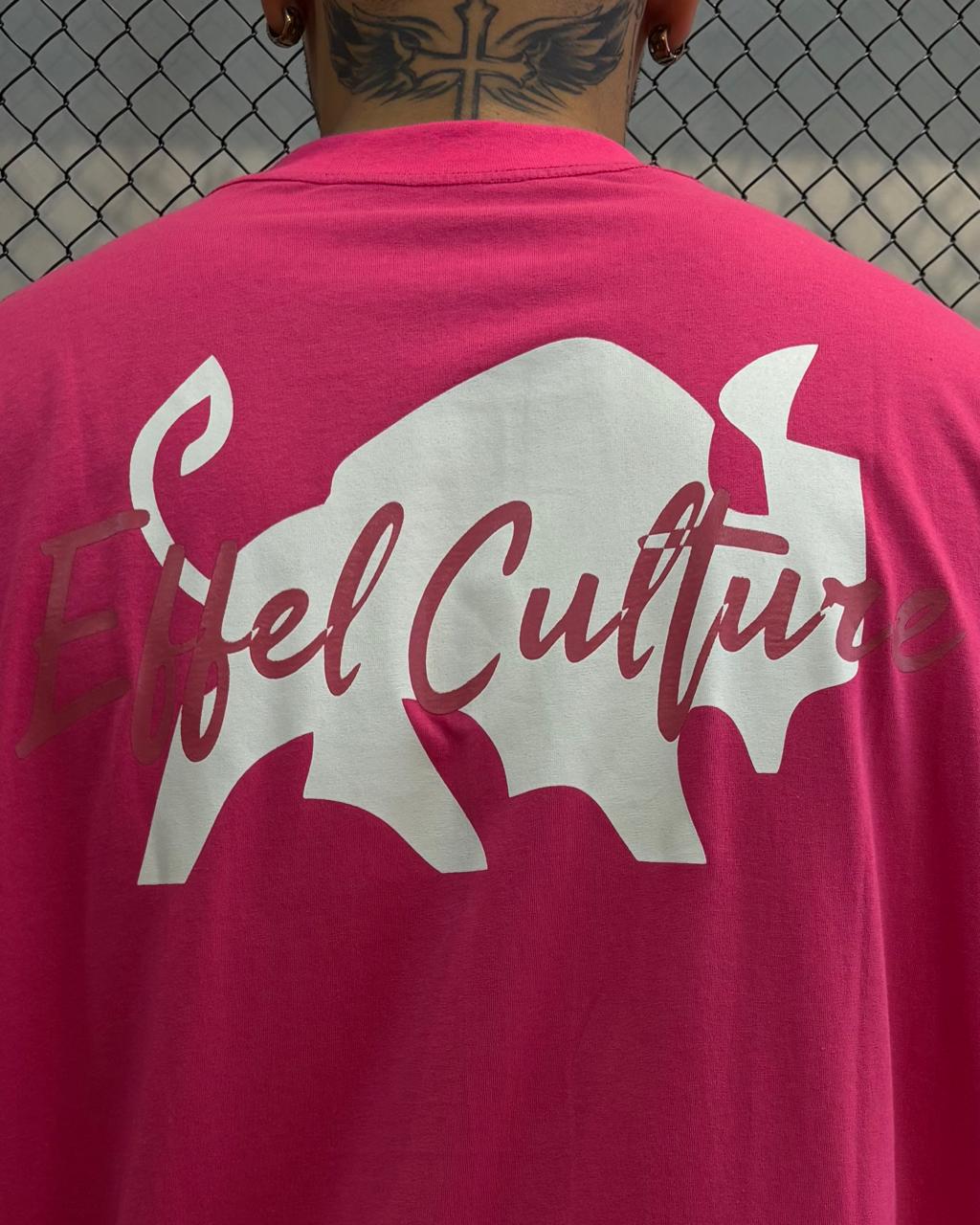 Estampa Traseira: As costas são o ponto focal. A poderosa silhueta do Bisão em branco serve de tela para o nome da marca, "Effel Culture", estilizado em um tom de rosa sobreposto, criando um efeito visual sofisticado e marcante.