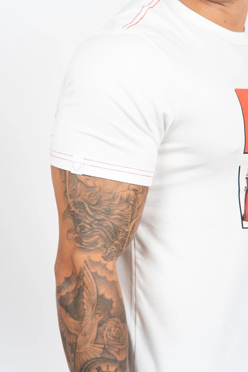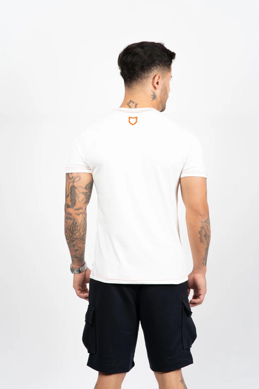 Costuras de Pesponto em Contraste: Apresenta costuras externas em tom laranja que realçam a gola, as mangas e a barra. Este detalhe sutil confere um ar sportwear e artesanal, destacando o contorno da camiseta.