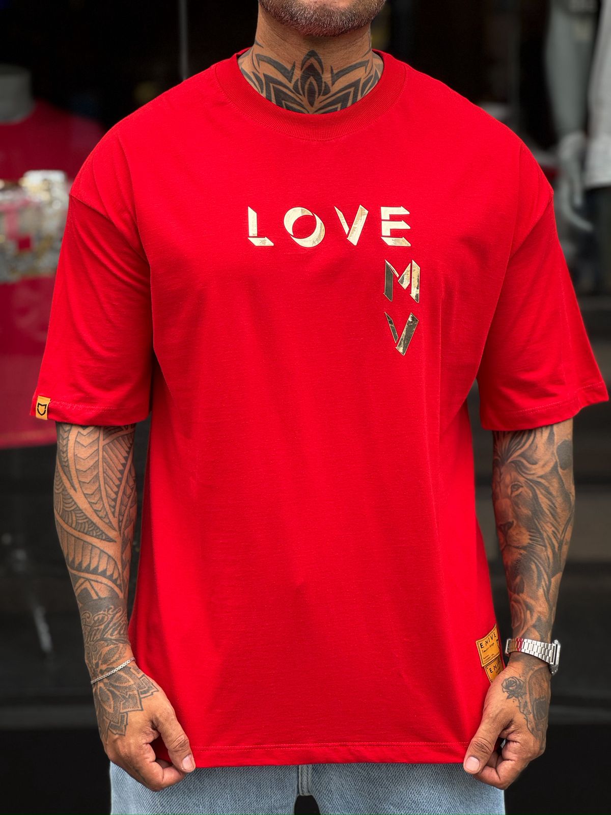 Apliques Metalizados em Destaque: Apresenta a palavra "LOVE" e as iniciais "MV" aplicadas no peito com um material dourado espelhado de alto brilho, conferindo uma estética de luxo à peça.