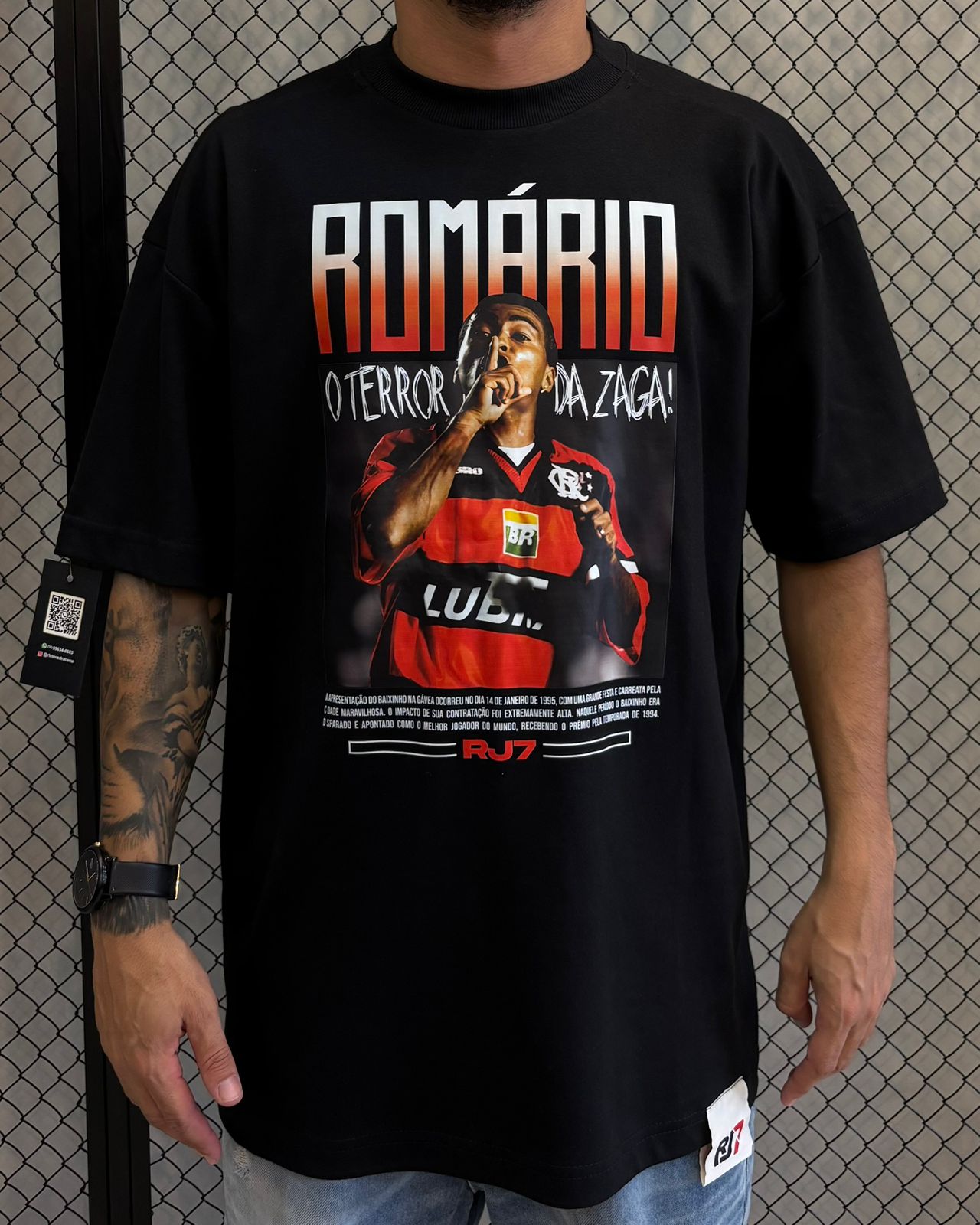 Essa camiseta da RJ7 é um item de colecionador que celebra um dos momentos mais icônicos do atacante: sua fase no clube de coração. Com um design que remete a manchetes de jornal e cores vibrantes, esta peça preta é pura história e streetwear carioca.