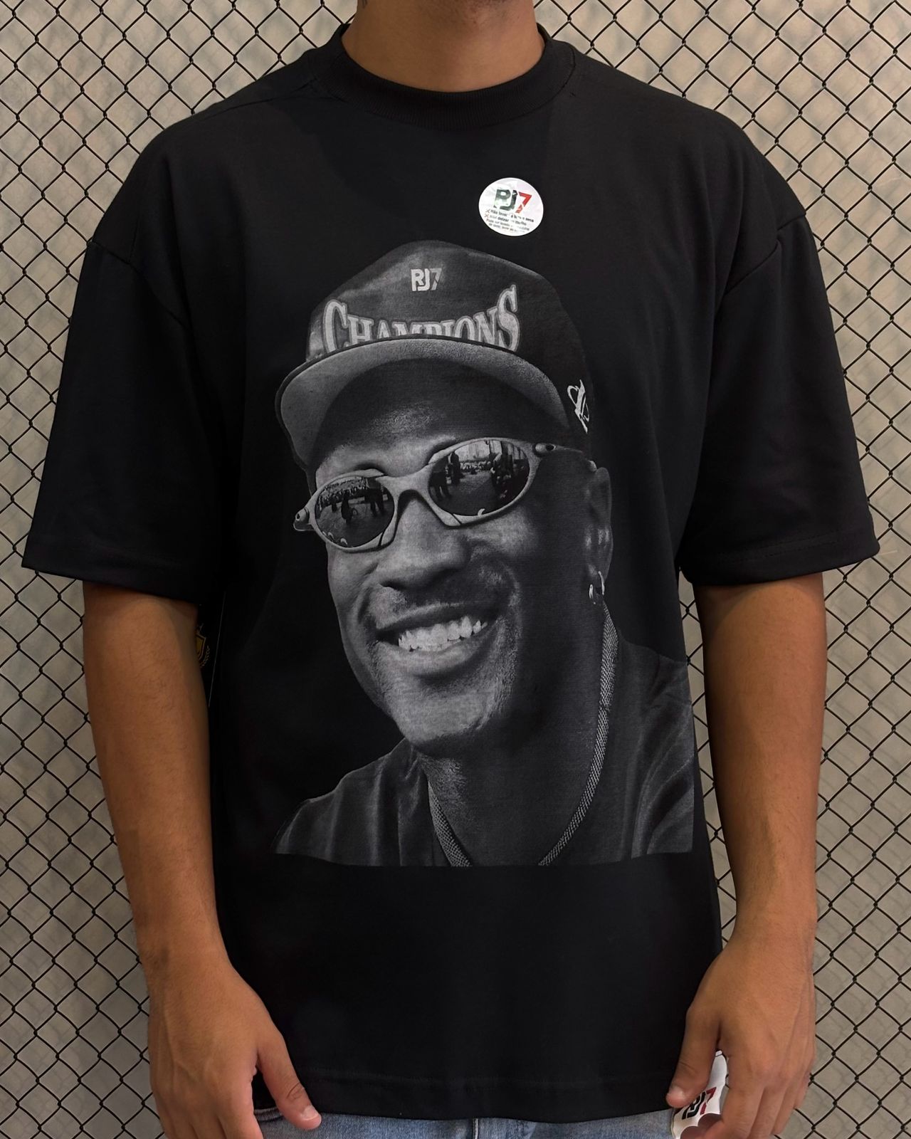 A Camiseta Oversized RJ7 "Rodman" é uma peça de colecionador para quem respira cultura urbana. Com uma estampa imponente em escala de cinza que captura o sorriso enigmático e os acessórios marcantes do "The Worm", esta camiseta transborda personalidade e atitude.
