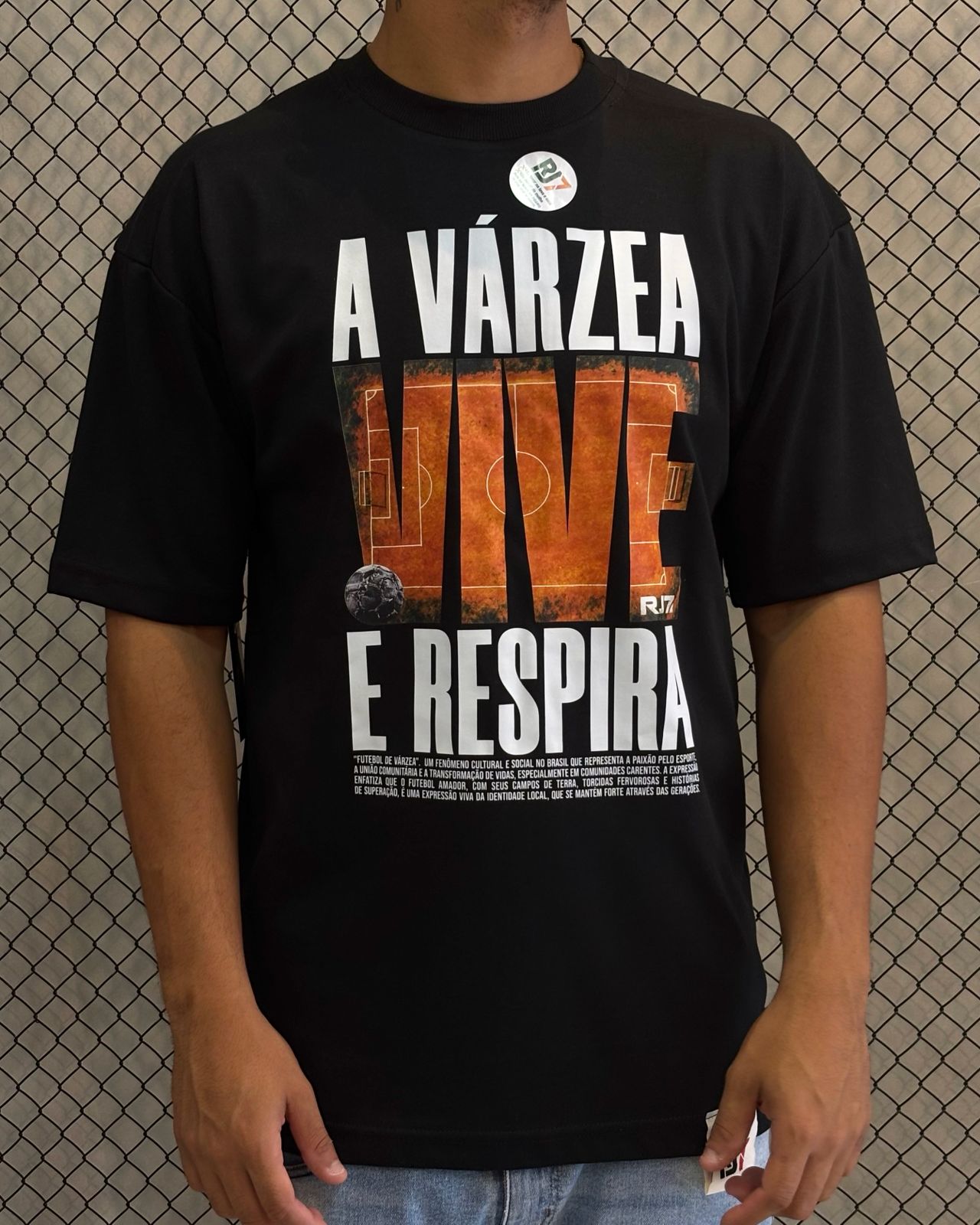Conceito "A Várzea Vive": A estampa central não é apenas um design; ela traz uma textura visual de campo de terra e um manifesto impresso que exalta a união comunitária e a paixão pelo esporte.