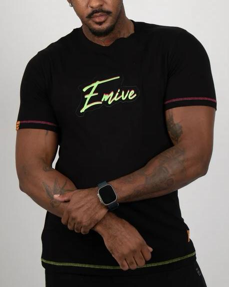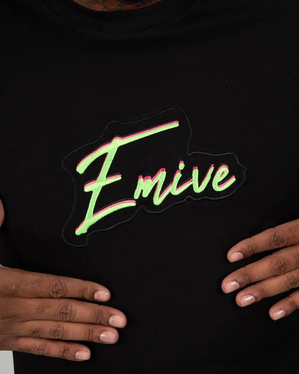 Logotipo em Degradê Neon: Apresenta a assinatura "Emive" centralizada no peito com um efeito de degradê que transita entre o verde-limão e o amarelo neon, contornado por uma sombra preta que dá profundidade à estampa.