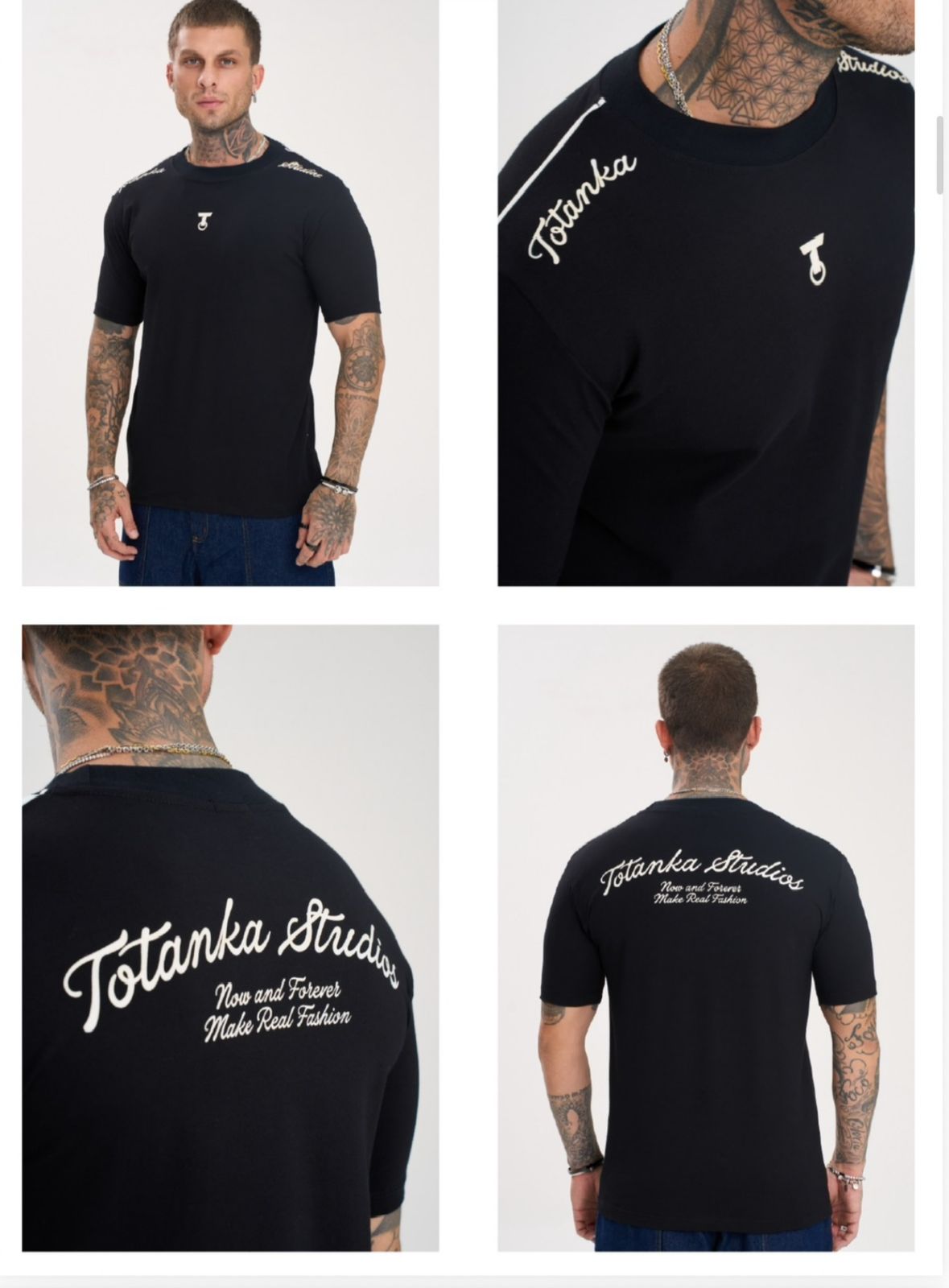 Branding nos Ombros (Shoulder Print): O grande diferencial desta peça são as inscrições "Totanka" e "Studios" localizadas sobre os ombros, emoldurando o rosto e trazendo uma estética esportiva de luxo.
