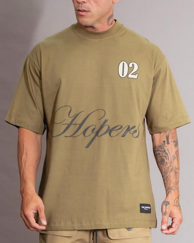 A The Hopers traz uma peça que equilibra perfeitamente o conforto extremo com um design inspirado nos uniformes esportivos retro. Sua cor oliva sólida serve como base perfeita para os detalhes gráficos contrastantes.