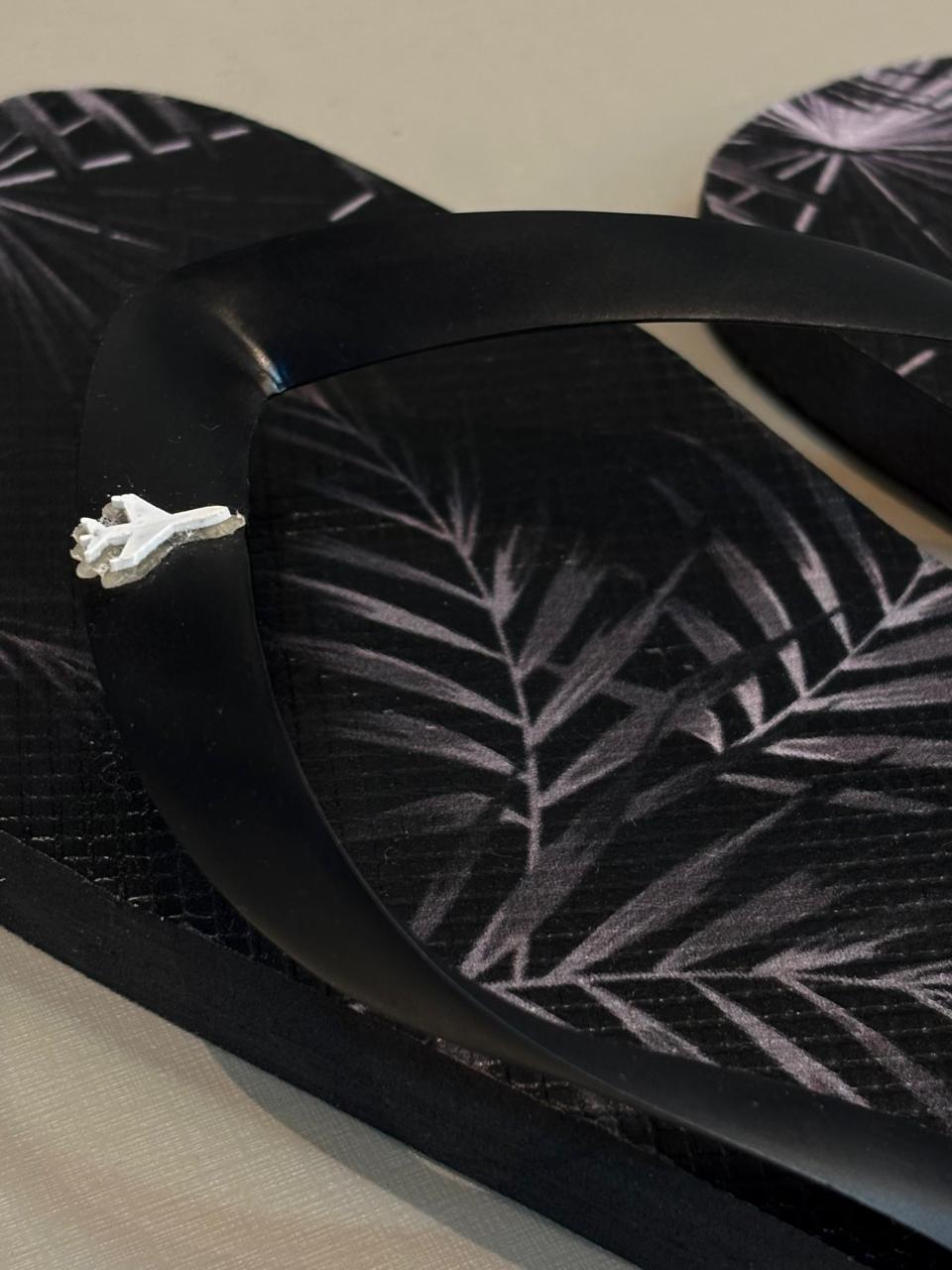 Aplicação Metálica: Ícone "Airplane" em metal prateado fixado na tira, elevando o nível de acabamento do chinelo.