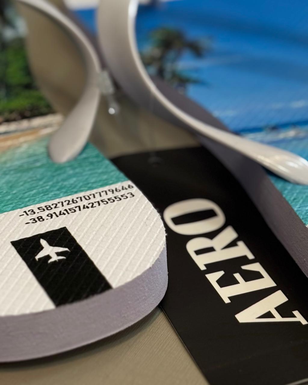 Detalhe de Coordenadas Geográficas: Apresenta inscrições de coordenadas e textos inspiracionais sobre "aventura e paraíso", reforçando o conceito "Ready to Fly" da marca.