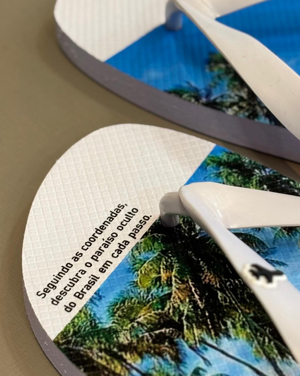 Estampa Fotográfica de Alta Definição: Solado personalizado com imagens de coqueiros e águas cristalinas, criando um visual de profundidade e realismo.