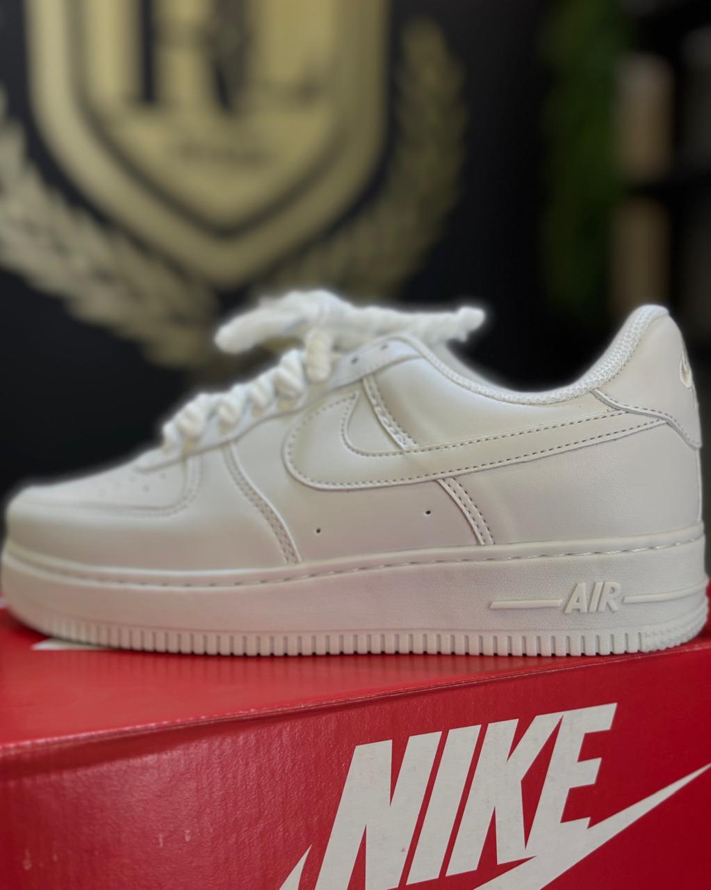 Estética 'Triple White' Imaculada: O tênis é totalmente branco – cabedal, cadarços, entressola e solado – conferindo um visual de pureza e frescor inigualável.