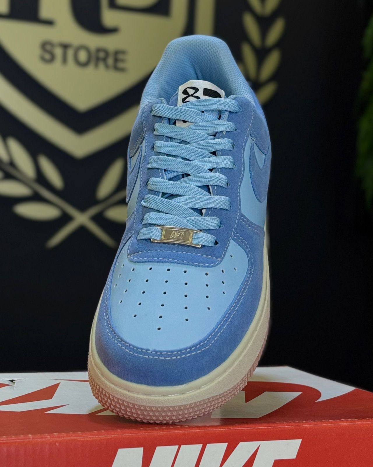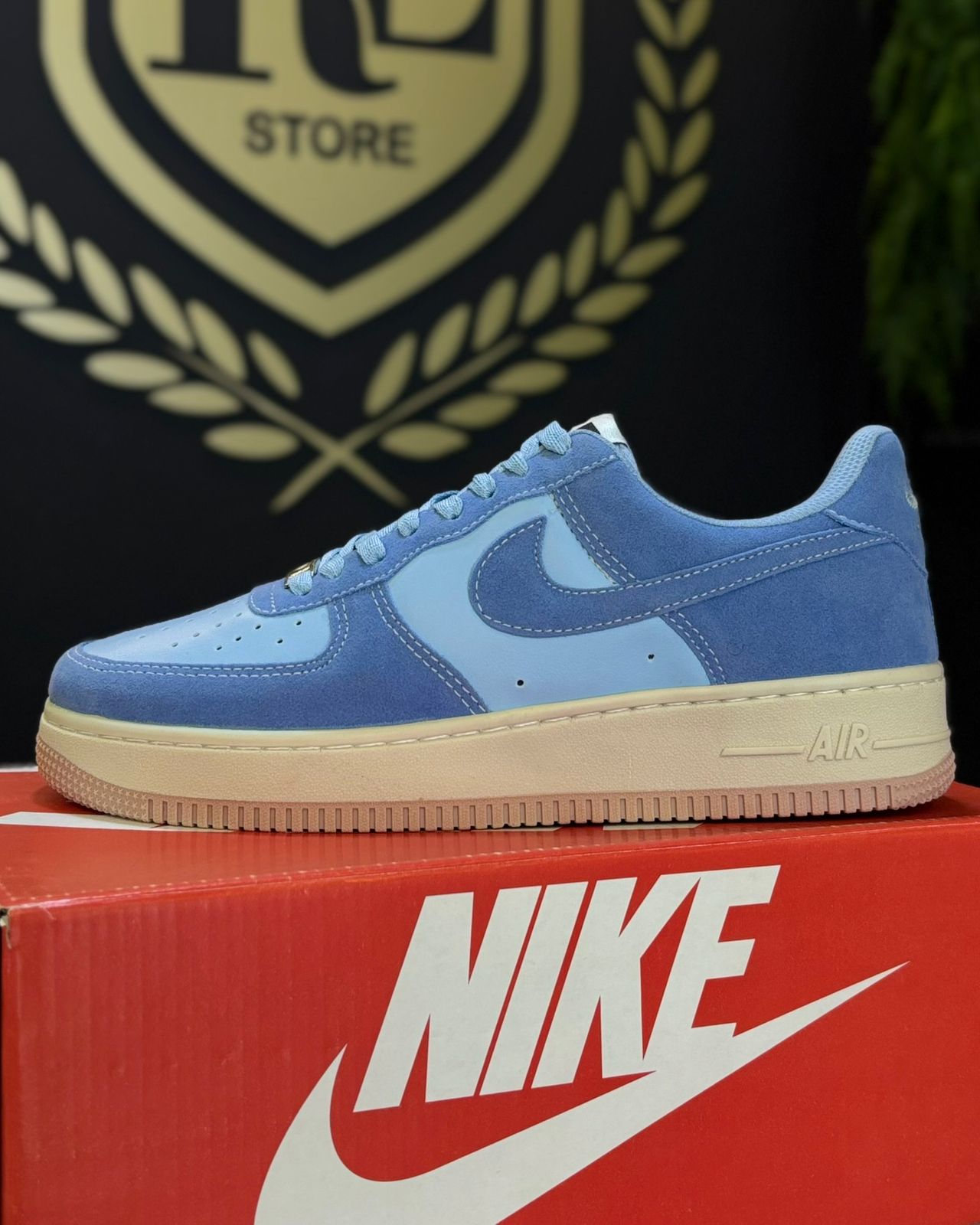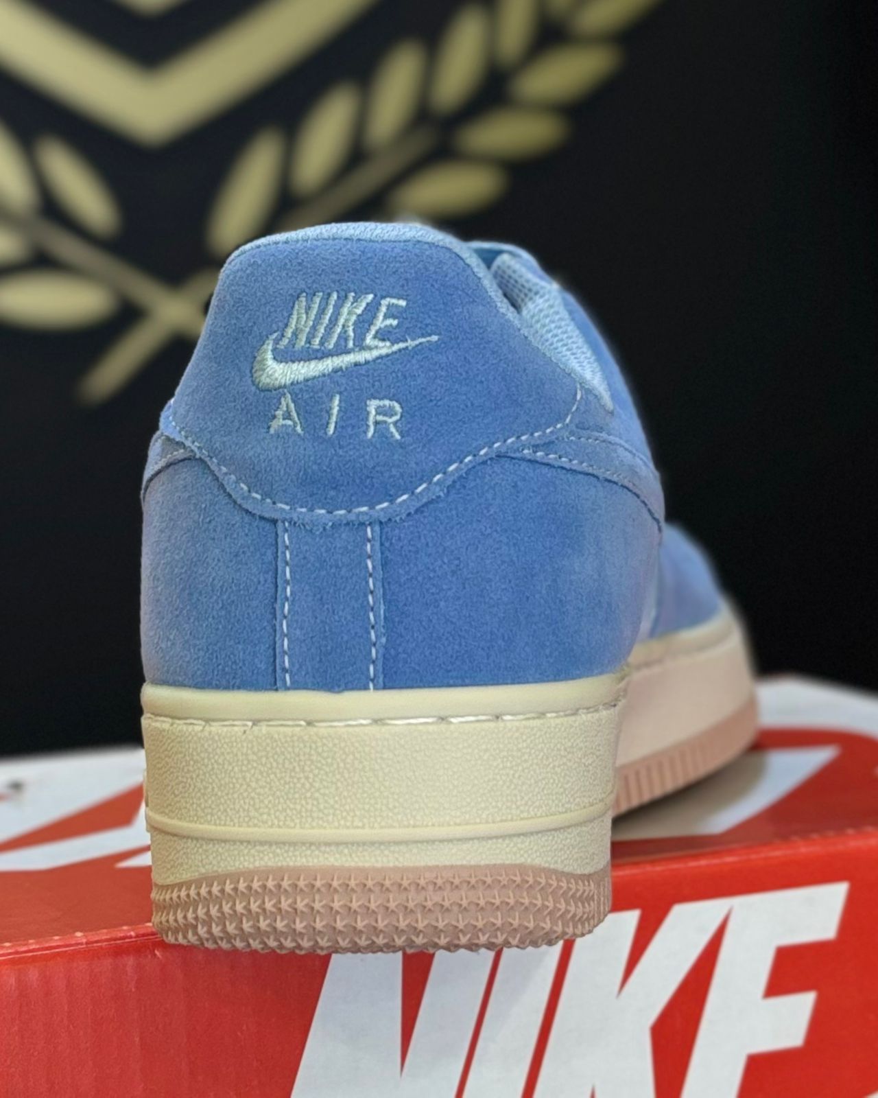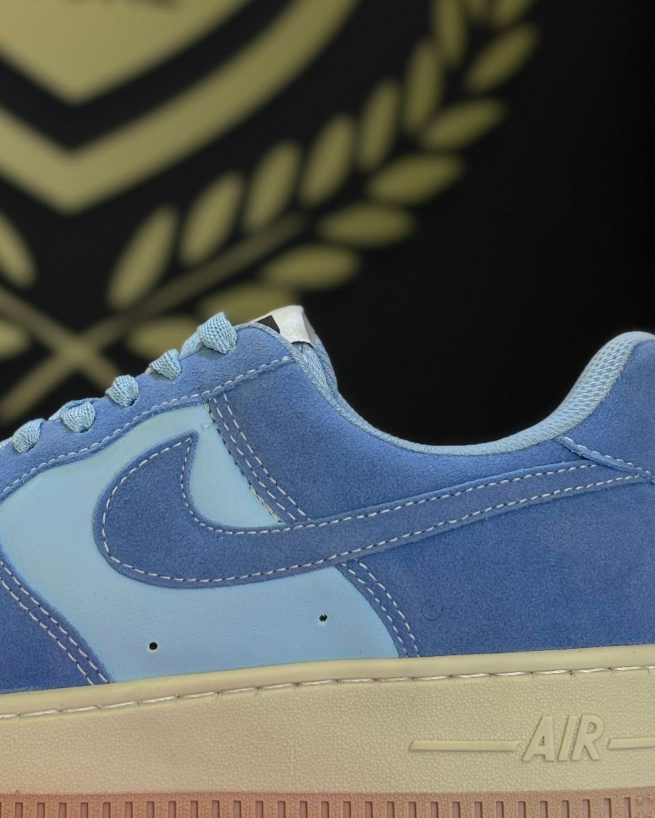 Cabedal Misto em Camurça e Couro: O painel principal do tênis (toebox, laterais e calcanhar) é feito em camurça aveludada em um tom de Azul Sereno. Já os painéis secundários (como a parte central do swoosh) utilizam um tom de azul mais claro, em couro liso/texturizado, criando uma profundidade visual de tonalidades de azul.