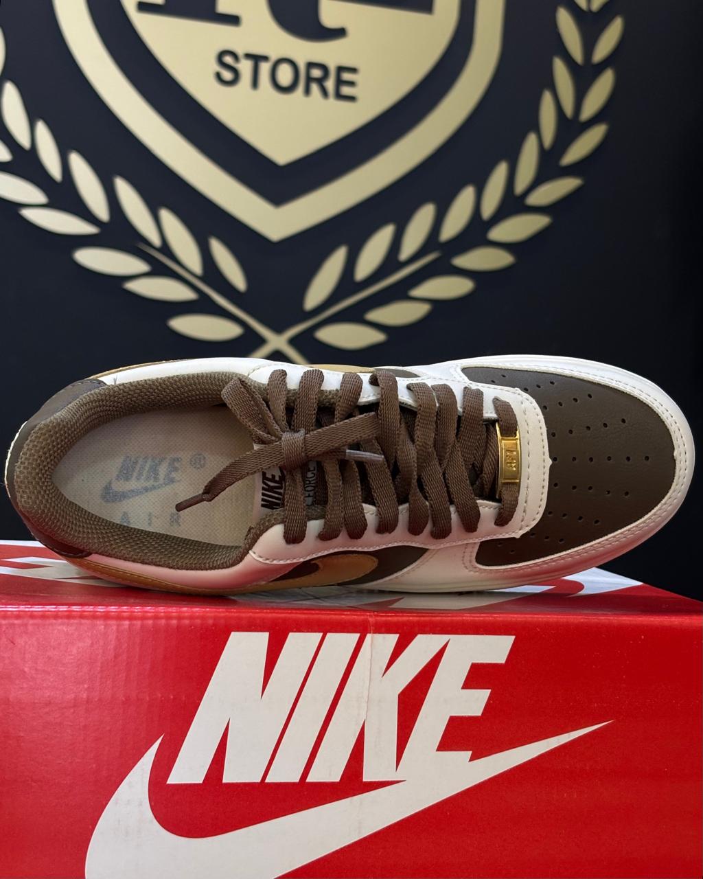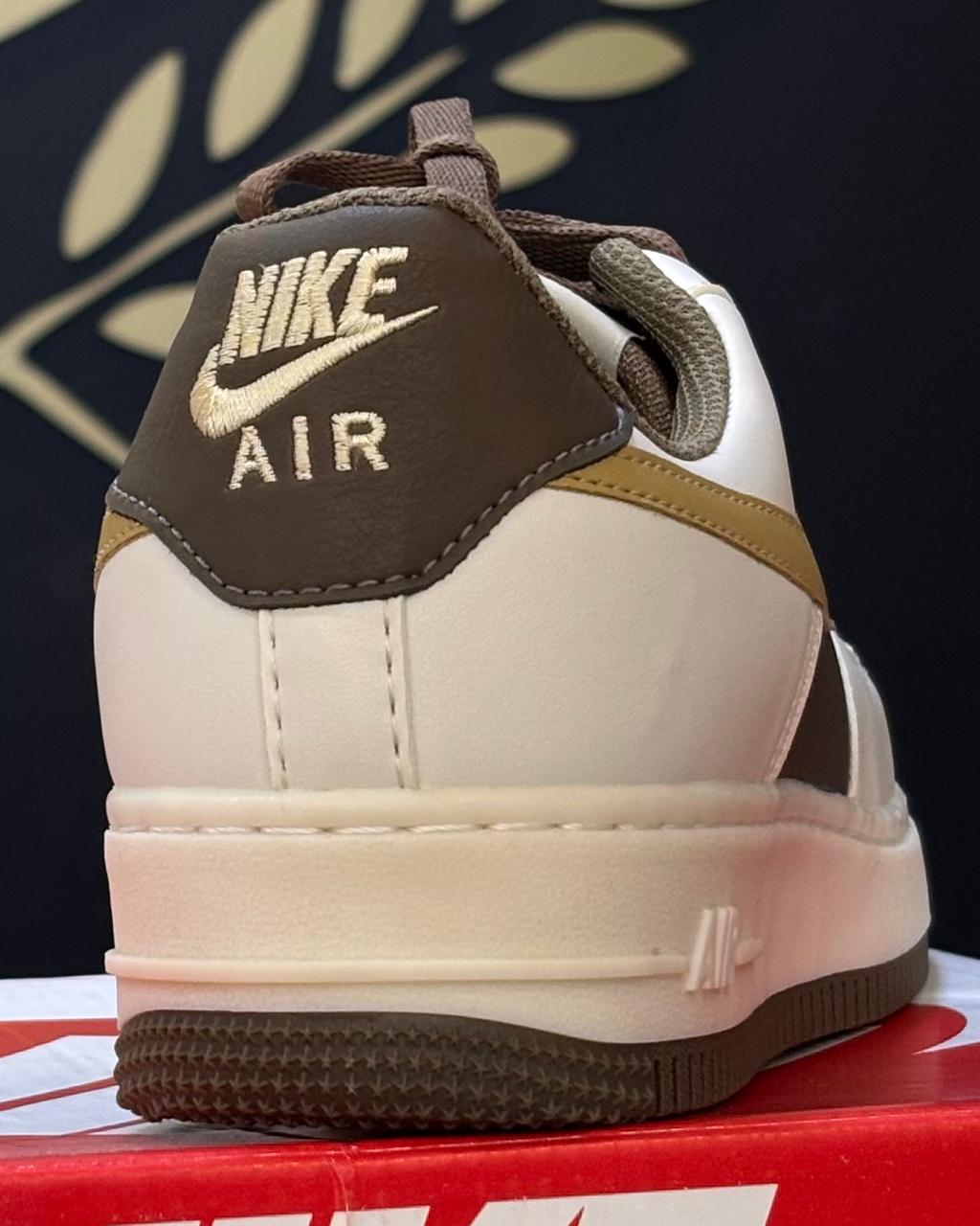 Combinação de Cores "Earth Tones": O contraste entre o branco off-white, o marrom chocolate e o Swoosh (logomarca) em tom bege caramelo traz uma estética refinada.