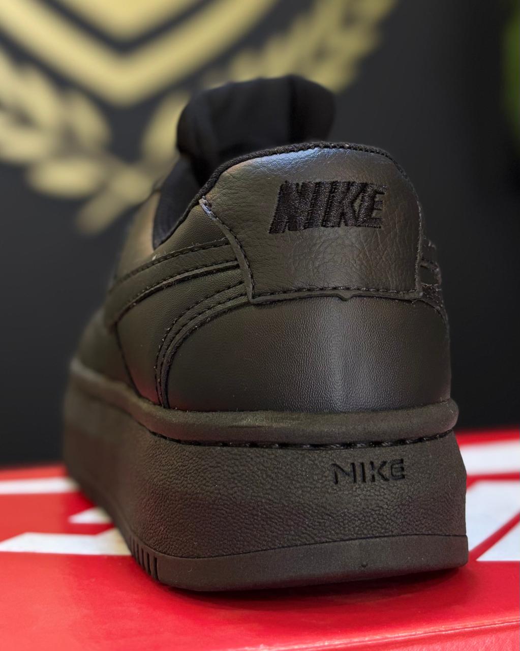 Cabedal Inspirado no Basquete Retrô: O design do cabedal (a parte superior do tênis) é limpo e remete aos tênis de basquete clássicos da Nike (como o Air Force 1), utilizando couro sintético preto para uma estética fácil de combinar.